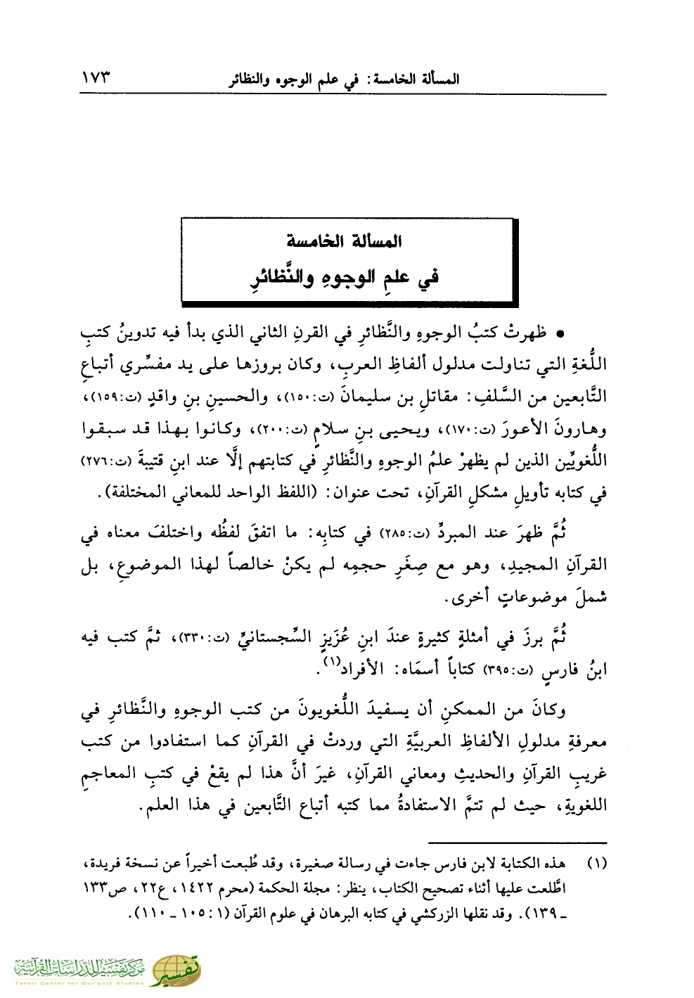 (¬1) هذه الكتابة لابن فارس جاءت في رسالة صغيرة، وقد طُبعت أخيراً عن نسخة فريدة، اطَّلعت عليها أثناء تصحيح الكتاب، ينظر: مجلة الحكمة (محرم 1422، ع22، ص133 - 139). وقد نقلها الزركشي في كتابه البرهان في علوم القرآن (1:105 - 110).
