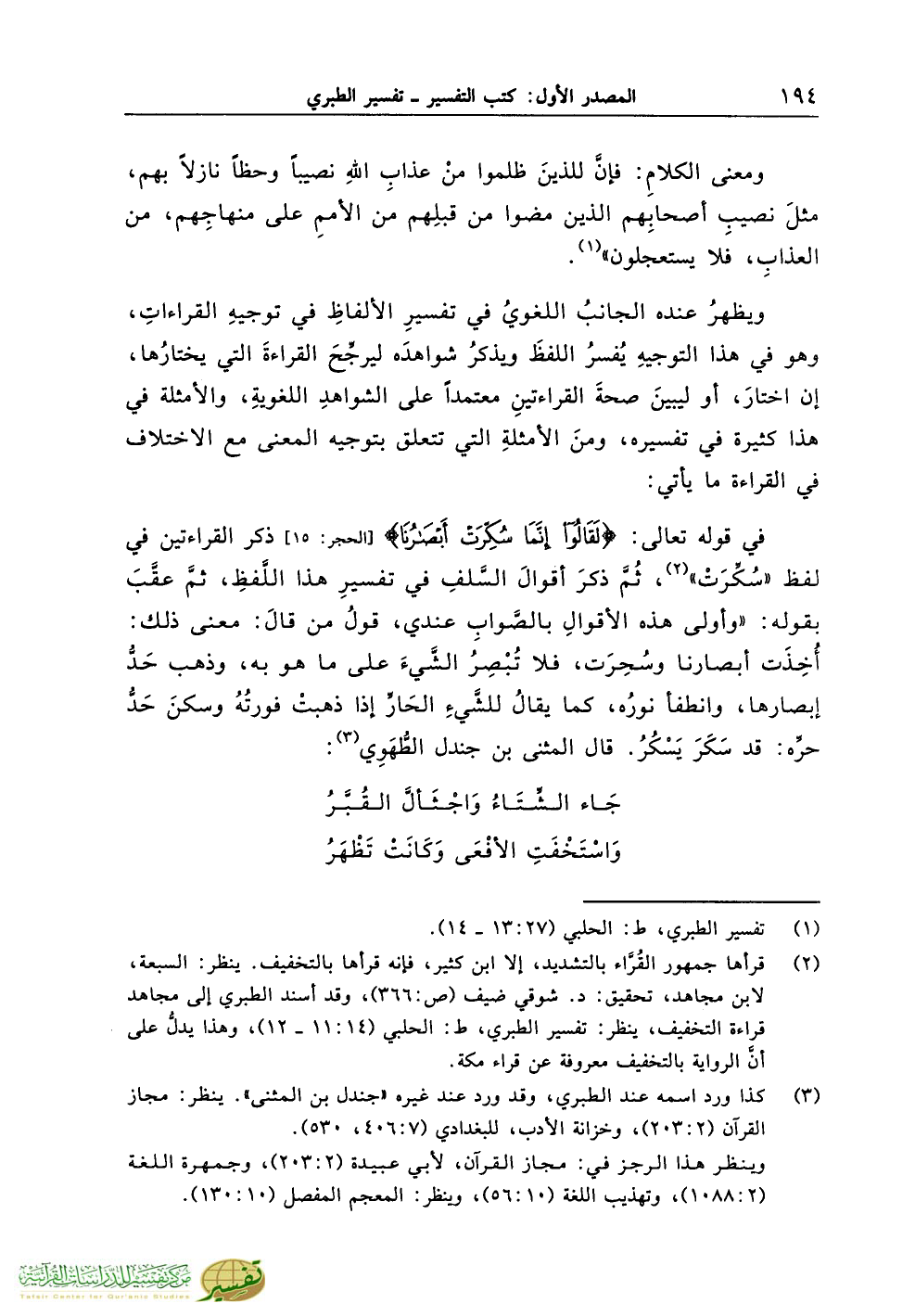 في قوله تعالى: {لَقَالُوا إِنَّمَا سُكِّرَتْ أَبْصَارُنَا} [الحجر: 15] ذكر القراءتين في لفظ «سُكِّرَتْ» (¬2)، ثُمَّ ذكرَ أقوالَ السَّلفِ في تفسيرِ هذا اللَّفظِ، ثمَّ عقَّبَ بقوله: «وأولى هذه الأقوالِ بالصَّوابِ عندي، قولُ من قالَ: معنى ذلك: أُخِذَت أبصارنا وسُحِرَت، فلا تُبْصِرُ الشَّيءَ على ما هو به، وذهب حَدُّ إبصارها، وانطفأ نورُه، كما يقالُ للشَّيءِ الحَارِّ إذا ذهبتْ فورتُهُ وسكنَ حَدُّ حرِّه: قد سَكَرَ يَسْكُرُ. قال المثنى بن جندل الطُّهَوِي (¬3):