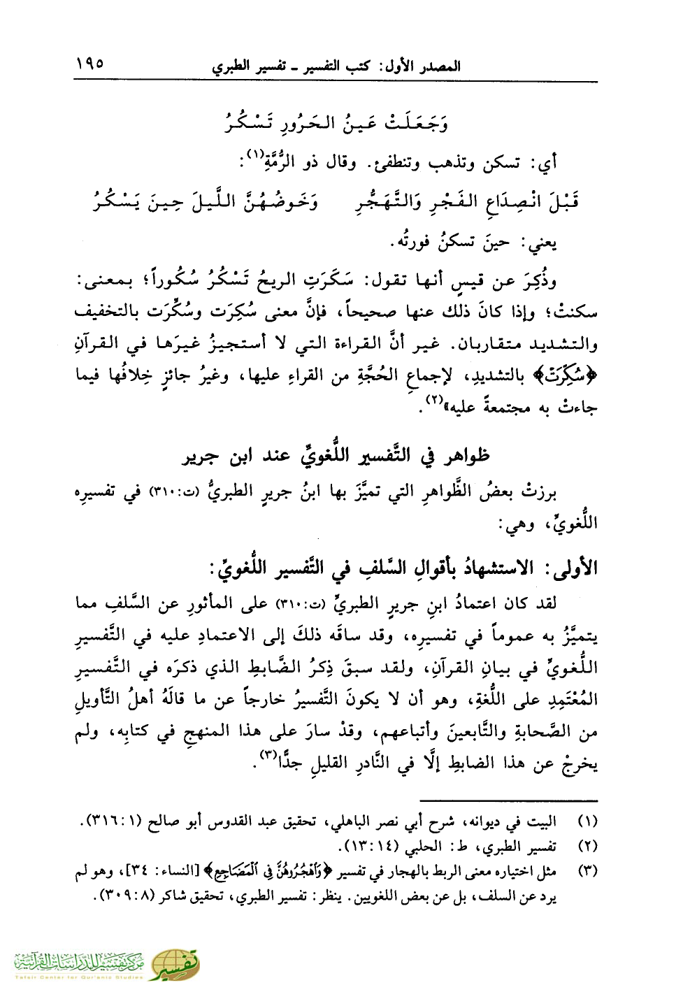 لقد كان اعتمادُ ابنِ جريرٍ الطبريِّ (ت:310) على المأثورِ عن السَّلفِ مما يتميَّزُ به عموماً في تفسيرِه، وقد ساقَه ذلكَ إلى الاعتمادِ عليه في التَّفسيرِ اللُّغويِّ في بيانِ القرآنِ، ولقد سبقَ ذِكرُ الضَّابطِ الذي ذكرَه في التَّفسيرِ المُعْتَمِدِ على اللُّغةِ، وهو أن لا يكونَ التَّفسيرُ خارجاً عن ما قالَهُ أهلُ التَّأويلِ من الصَّحابةِ والتَّابعينَ وأتباعهم، وقدْ سارَ على هذا المنهجِ في كتابِه، ولم يخرجْ عن هذا الضابطِ إلاَّ في النَّادرِ القليلِ جدًّا (¬3).