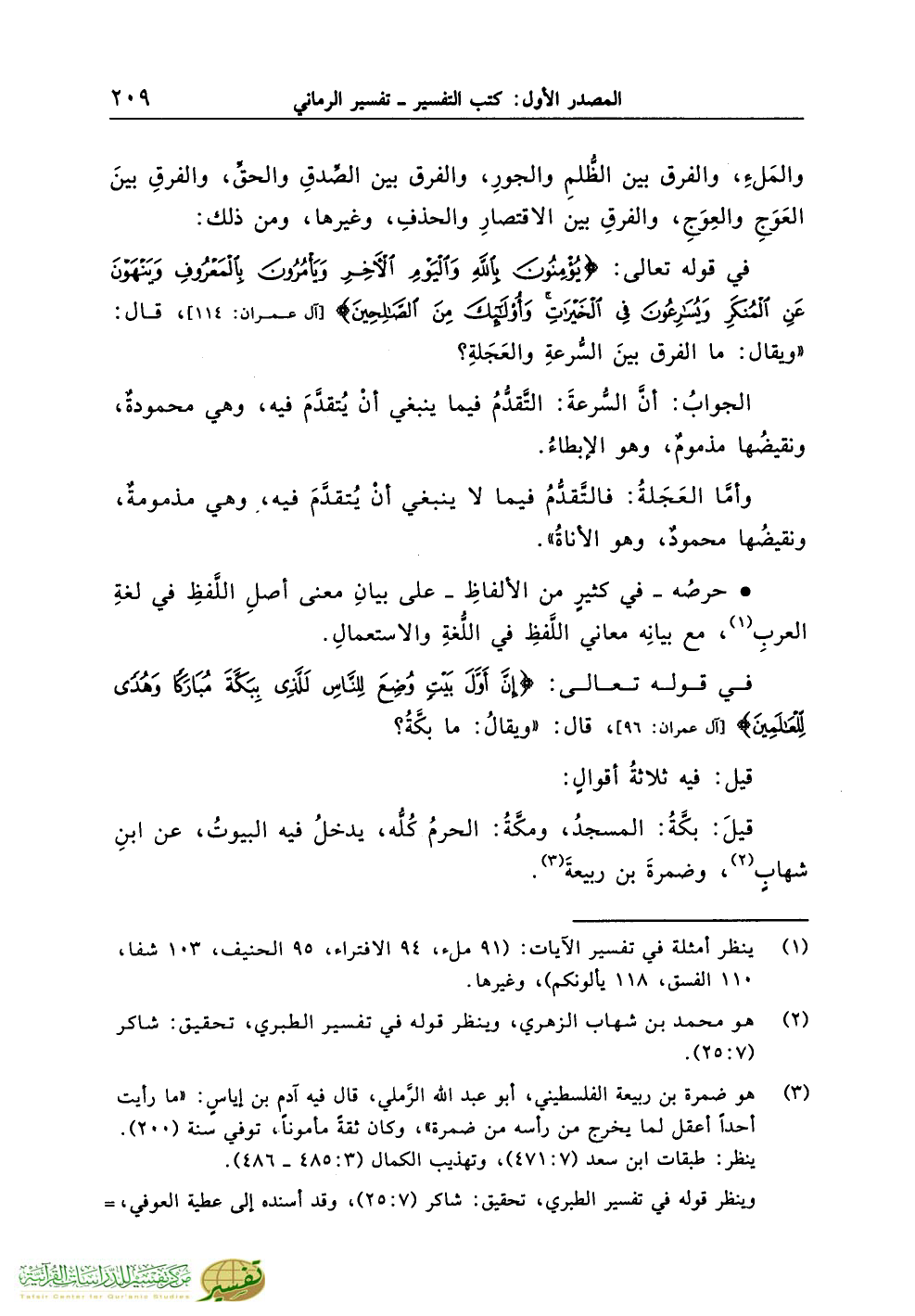 في قوله تعالى: {يُؤْمِنُونَ بِاللَّهِ وَالْيَوْمِ الآخِرِ وَيَامُرُونَ بِالْمَعْرُوفِ وَيَنْهَوْنَ عَنِ الْمُنْكَرِ وَيُسَارِعُونَ فِي الْخَيْرَاتِ وَأُولَئِكَ مِنَ الصَّالِحِينَ} [آل عمران: 114]، قال: «ويقال: ما الفرق بينَ السُّرعةِ والعَجَلةِ؟