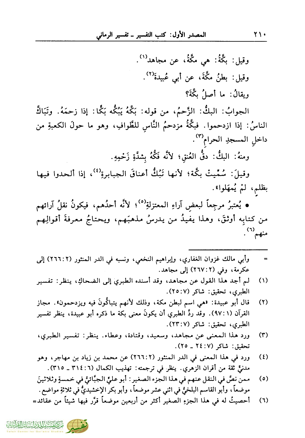 (¬2) قال أبو عبيدة: «هي اسم لبطن مكة، وذلك لأنهم يتباكُّونَ فيه ويزدحمون». مجاز القرآن (1:97). وقد ردَّ الطبري أن يكونَ معنى بكة ما ذكره أبو عبيدة، ينظر تفسير الطبري، تحقيق: شاكر (7:23).