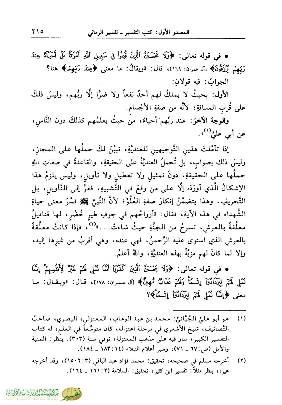 (¬1) هو أبو عليٍّ الجُبَّائيِّ: محمد بن عبد الوهاب، المعتزلي، البصري، صاحبُ التَّصانيف، شيخ الأشعري في مرحلة اعتزاله، كان متوسِّعاً في العلمِ، له كتاب التفسير الكبير، سار فيه على مذهب المعتزلة، توفي سنة (303). ينظر: المنية والأمل (ص:67 - 71)، وسير أعلام النبلاء (14:183 - 184).
