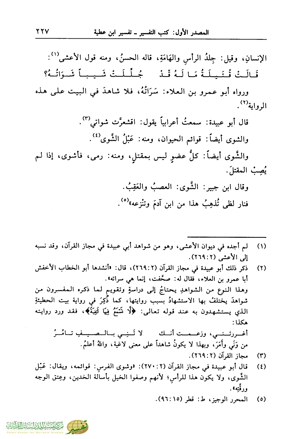 (¬4) قال أبو عبيدة في مجاز القرآن (2:270): «وشوى الفرسِ: قوائمه، ويقال: عَبْل الشَّوى، ولا يكون هذا للرأسِ؛ لأنهم وصفوا الخيل بأسالة الخدين، وعِتق الوجه ورقَّتِه».