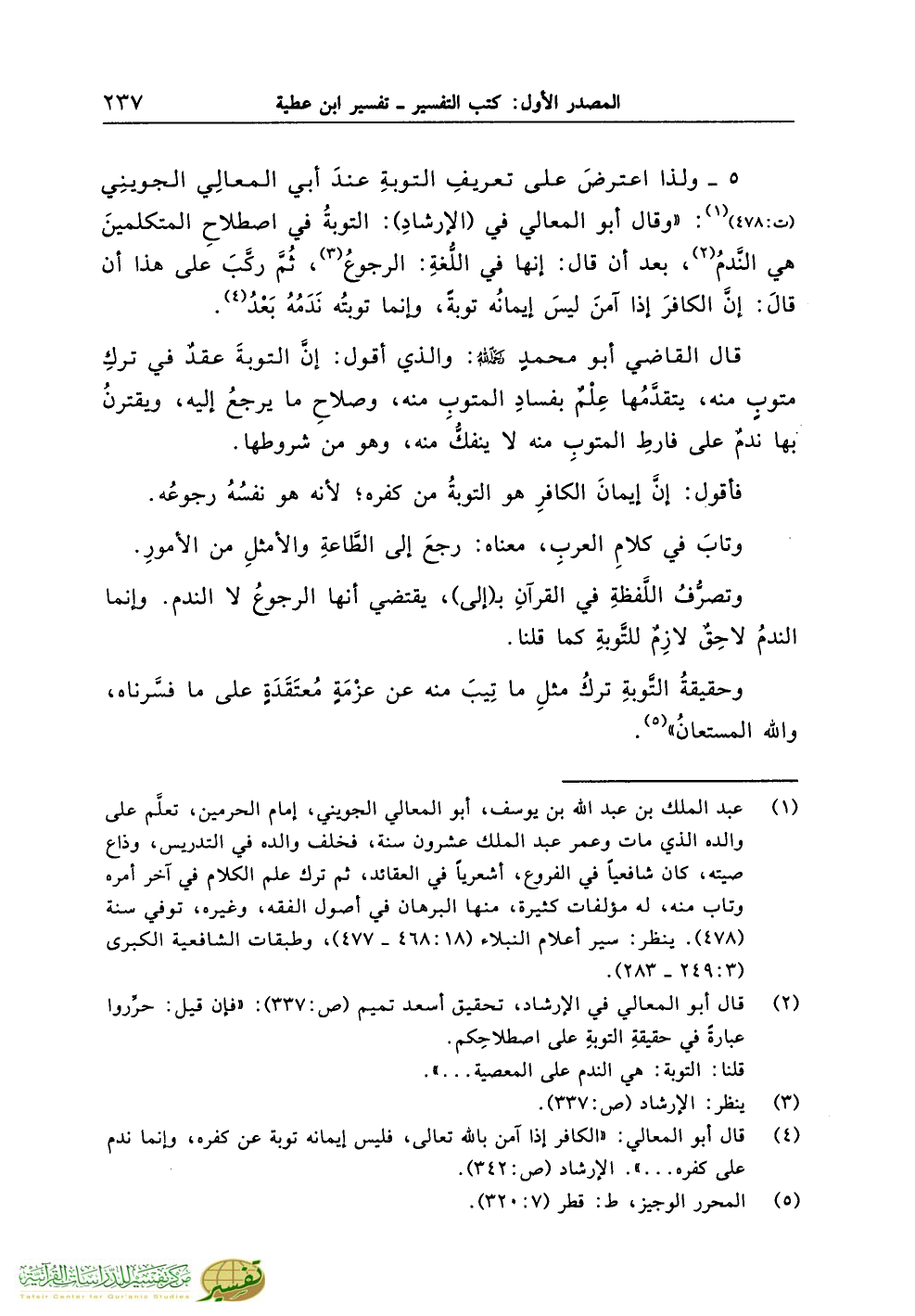 (¬2) قال أبو المعالي في الإرشاد، تحقيق أسعد تميم (ص:337): «فإن قيل: حرِّروا عبارةً في حقيقةِ التوبةِ على اصطلاحِكم.
