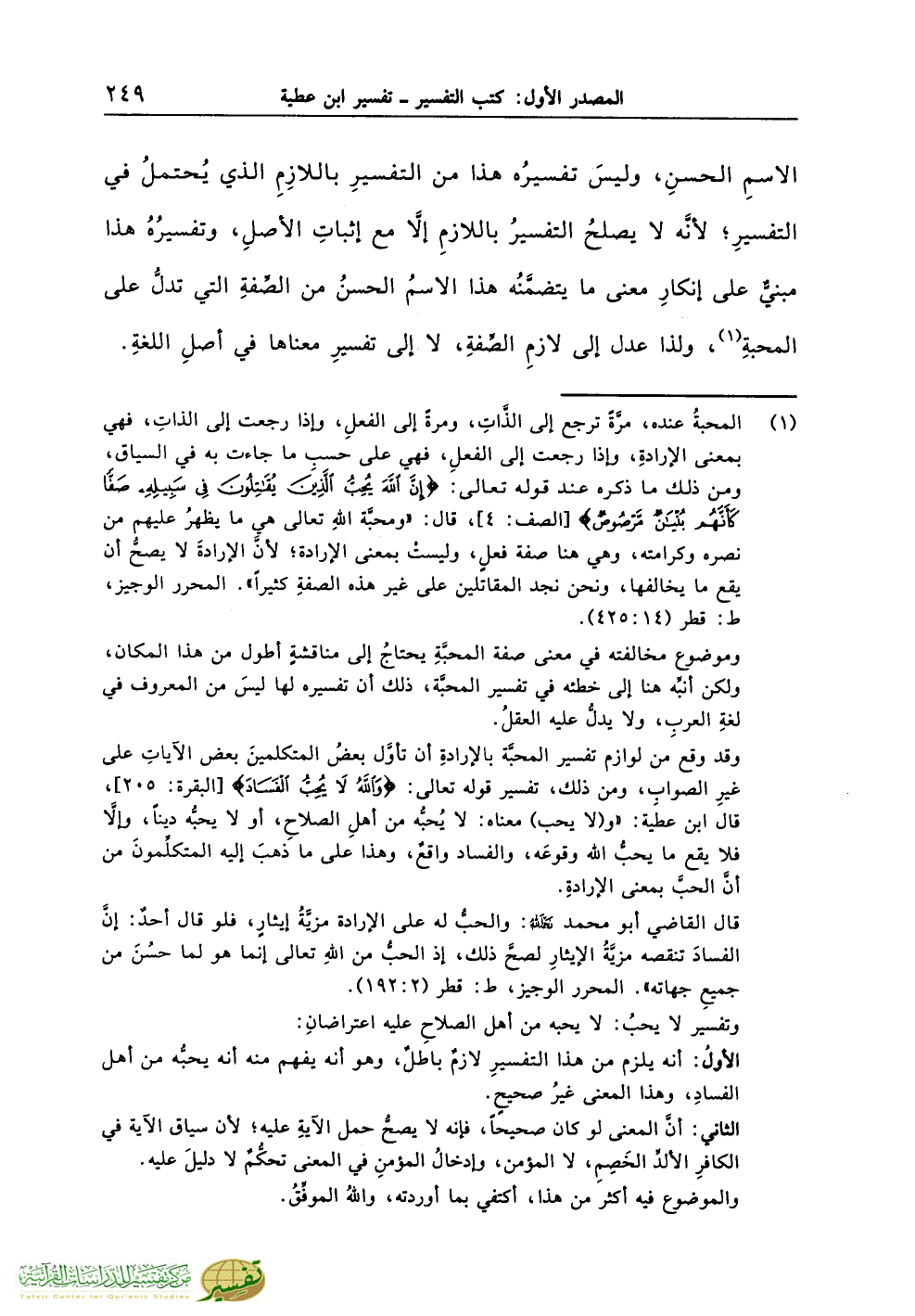 قال القاضي أبو محمد رحمه الله: والحبُّ له على الإرادة مزيَّةُ إيثارٍ، فلو قال أحدٌ: إنَّ الفسادَ تنقصه مزيَّةُ الإيثارِ لصحَّ ذلك، إذ الحبُّ من اللهِ تعالى إنما هو لما حسُنَ من جميعِ جهاته». المحرر الوجيز، ط: قطر (2:192).