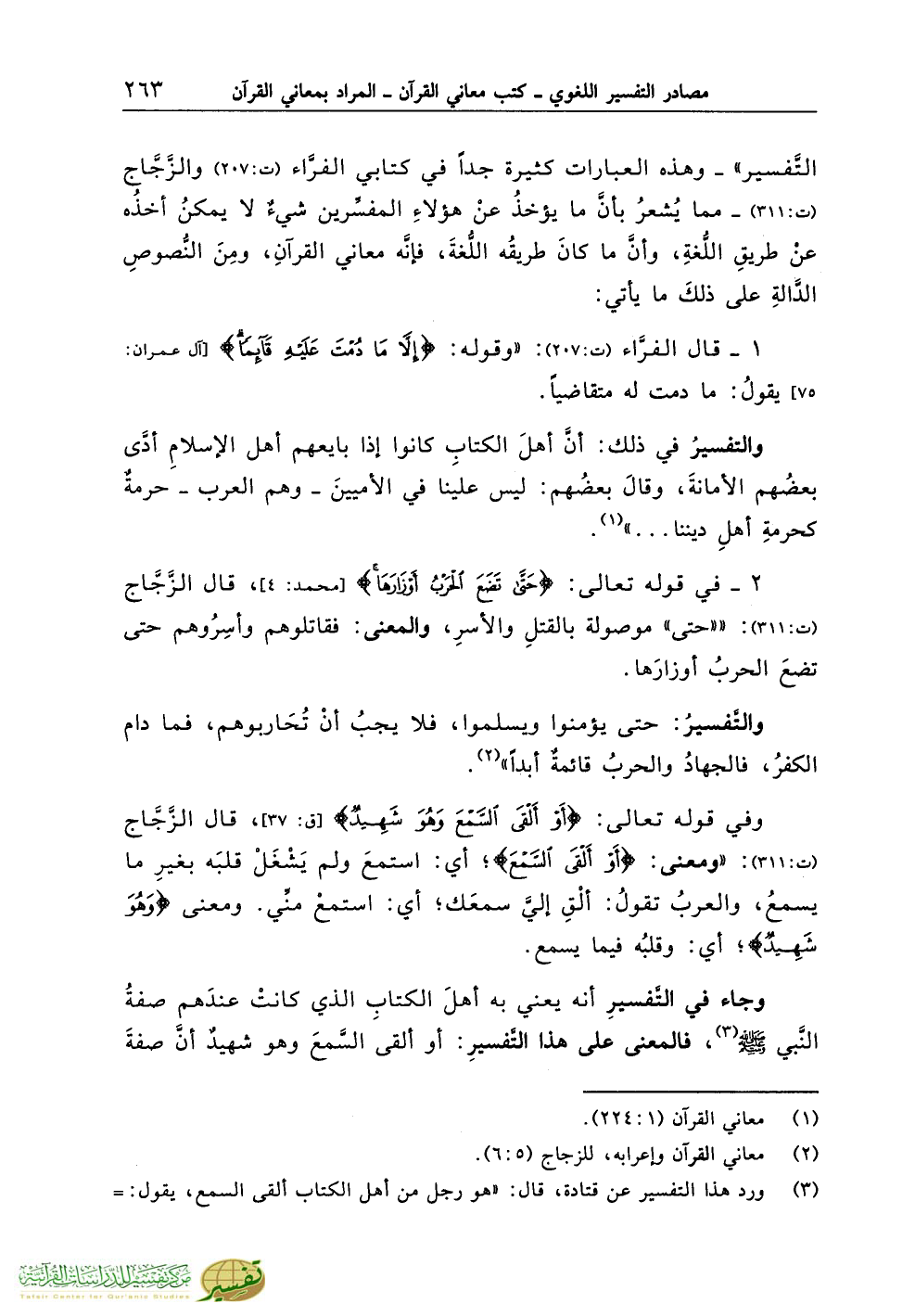 التَّفسير» ـ وهذه العبارات كثيرة جداً في كتابي الفرَّاء (ت:207) والزَّجَّاج (ت:311) ـ مما يُشعرُ بأنَّ ما يؤخذُ عنْ هؤلاءِ المفسِّرين شيءٌ لا يمكنُ أخذُه عنْ طريقِ اللُّغةِ، وأنَّ ما كانَ طريقُه اللُّغةَ، فإنَّه معاني القرآنِ، ومِنَ النُّصوصِ الدَّالةِ على ذلكَ ما يأتي: