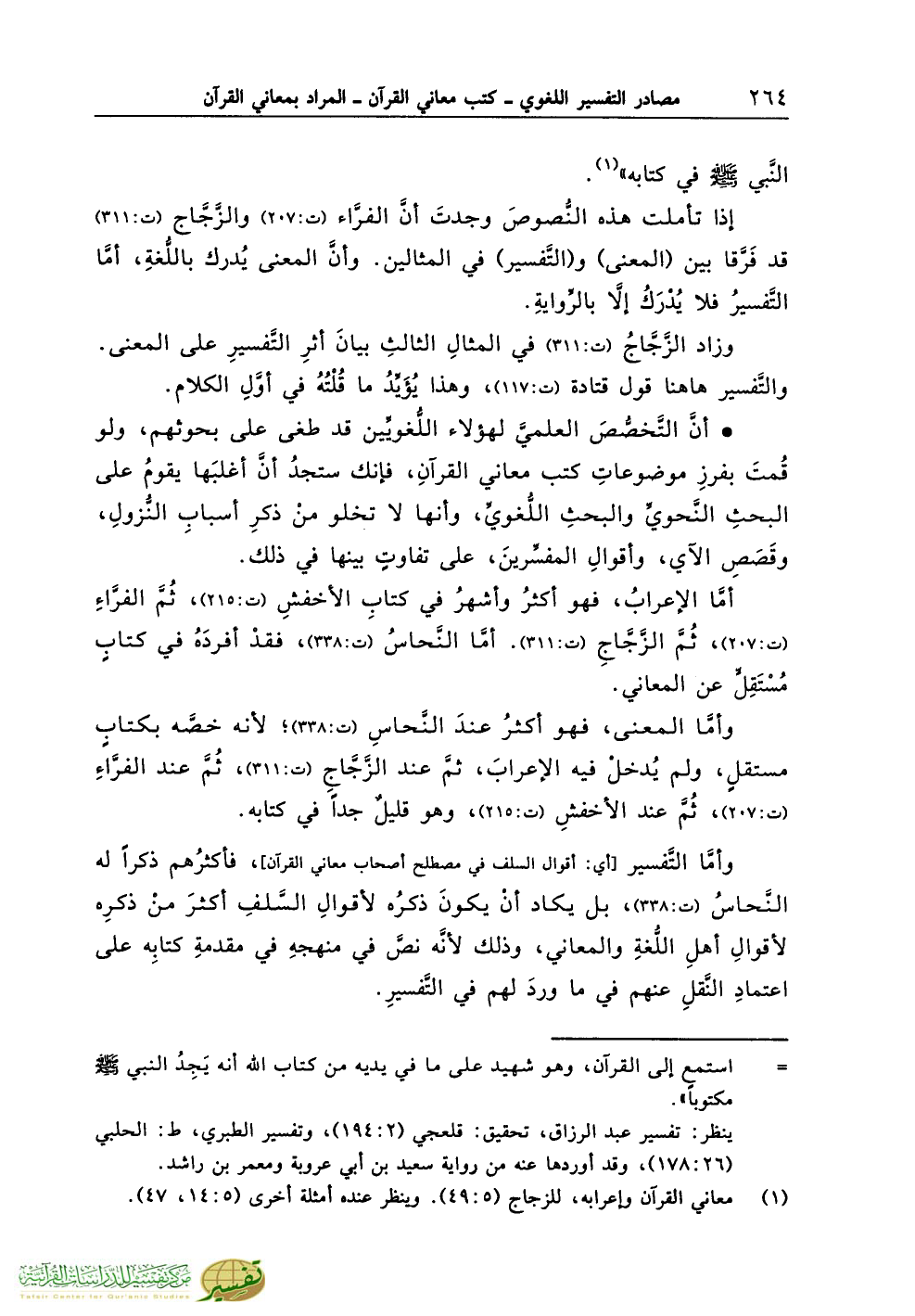 وأمَّا التَّفسير [أي: أقوال السلف في مصطلح أصحاب معاني القرآن]، فأكثرُهم ذكراً له النَّحاسُ (ت:338)، بل يكاد أنْ يكونَ ذكرُه لأقوالِ السَّلفِ أكثرَ منْ ذكرِه لأقوالِ أهلِ اللُّغةِ والمعاني، وذلك لأنَّه نصَّ في منهجهِ في مقدمةِ كتابِه على اعتمادِ النَّقلِ عنهم في ما وردَ لهم في التَّفسيرِ.
