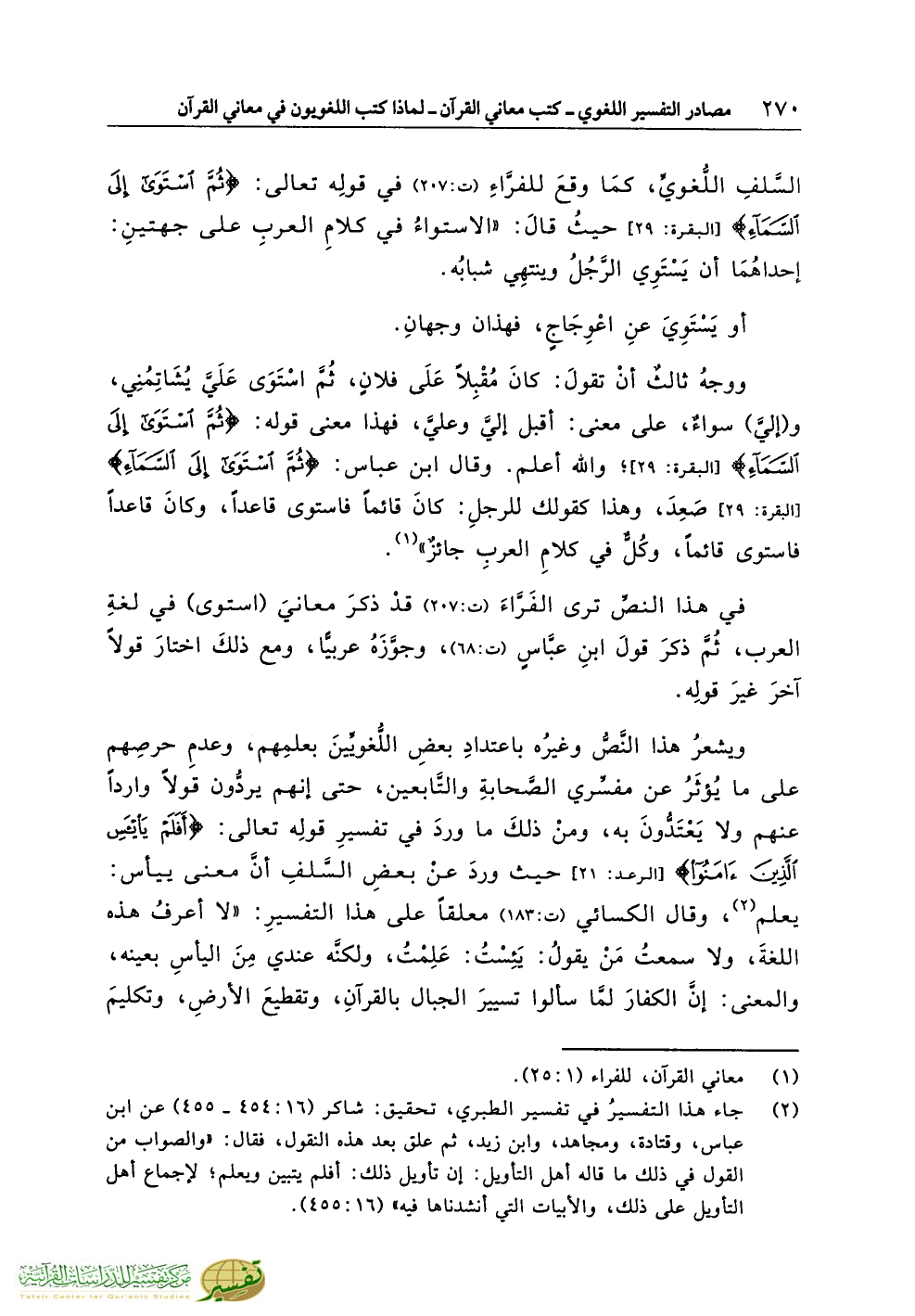 في هذا النصِّ ترى الفَرَّاءَ (ت:207) قدْ ذكرَ معانيَ (استوى) في لغةِ العرب، ثُمَّ ذكرَ قولَ ابنِ عبَّاسٍ (ت:68)، وجوَّزَهُ عربيًّا، ومع ذلكَ اختارَ قولاً آخرَ غيرَ قولِه.