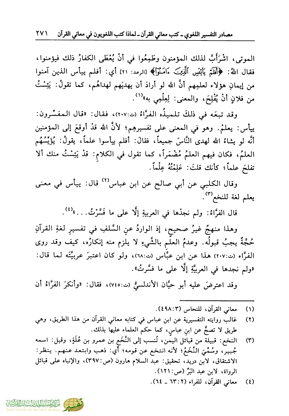 وهذا منهجٌ غيرُ صحيحٍ، إذ الواردُ عنِ السَّلفِ في تفسيرِ لغةِ القرآنِ حُجَّةٌ يجبُ قبولُه. وعدمُ العلمِ بالشَّيءِ لا يلزم منه إنكارُه، كيف وقد روى الفرَّاء (ت:207) هذا عن ابن عبَّاس (ت:68)، ولو كان اعتبرَ عربيَّتَه لما قال: «ولم نجدها في العربيَّةِ إلاَّ على ما فسَّرتُ».