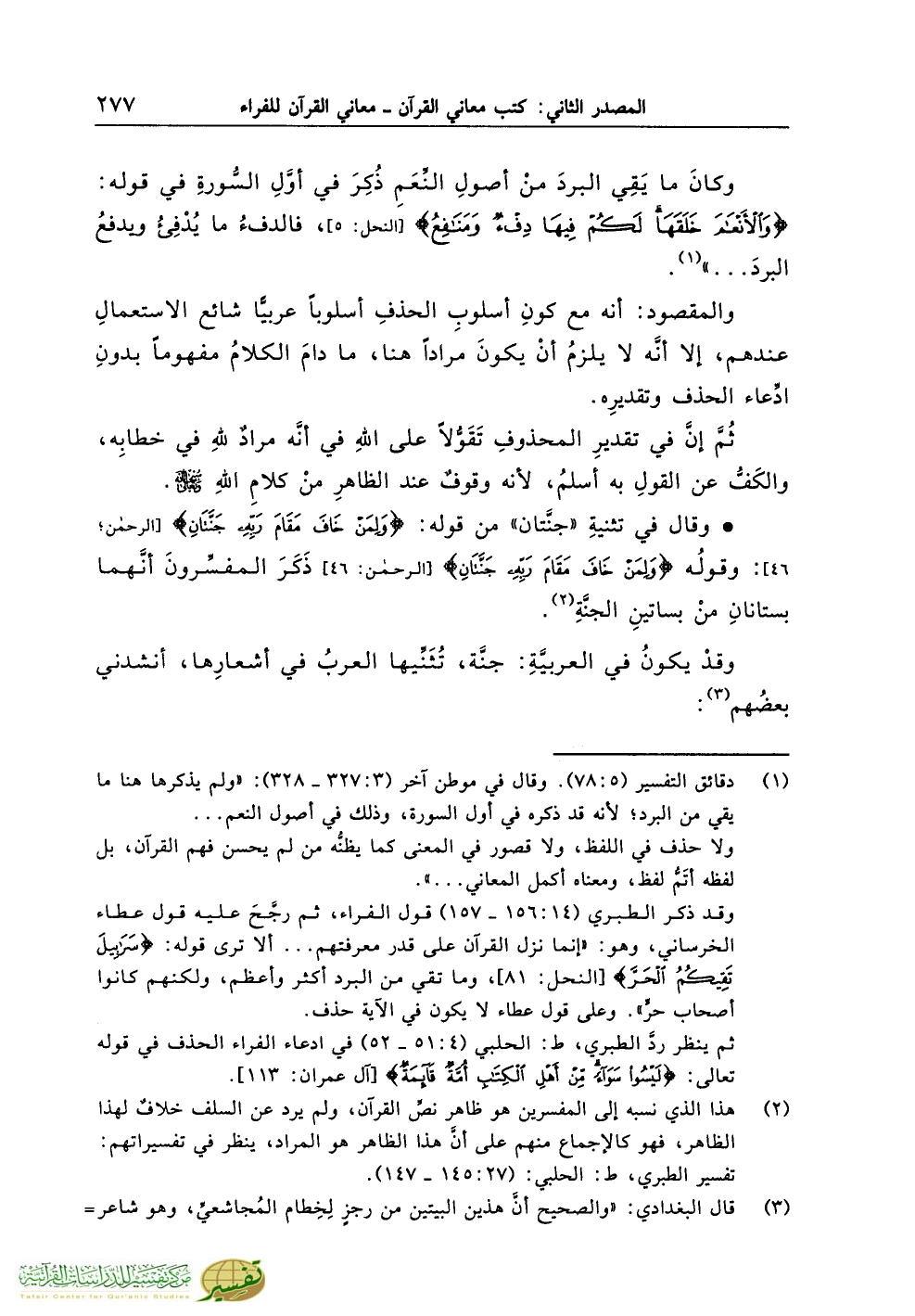ثم ينظر ردَّ الطبري، ط: الحلبي (4:51 - 52) في ادعاء الفراء الحذف في قوله تعالى: {لَيْسُوا سَوَاءً مِنْ أَهْلِ الْكِتَابِ أُمَةٌ قَائِمَةٌ} [آل عمران: 113].
