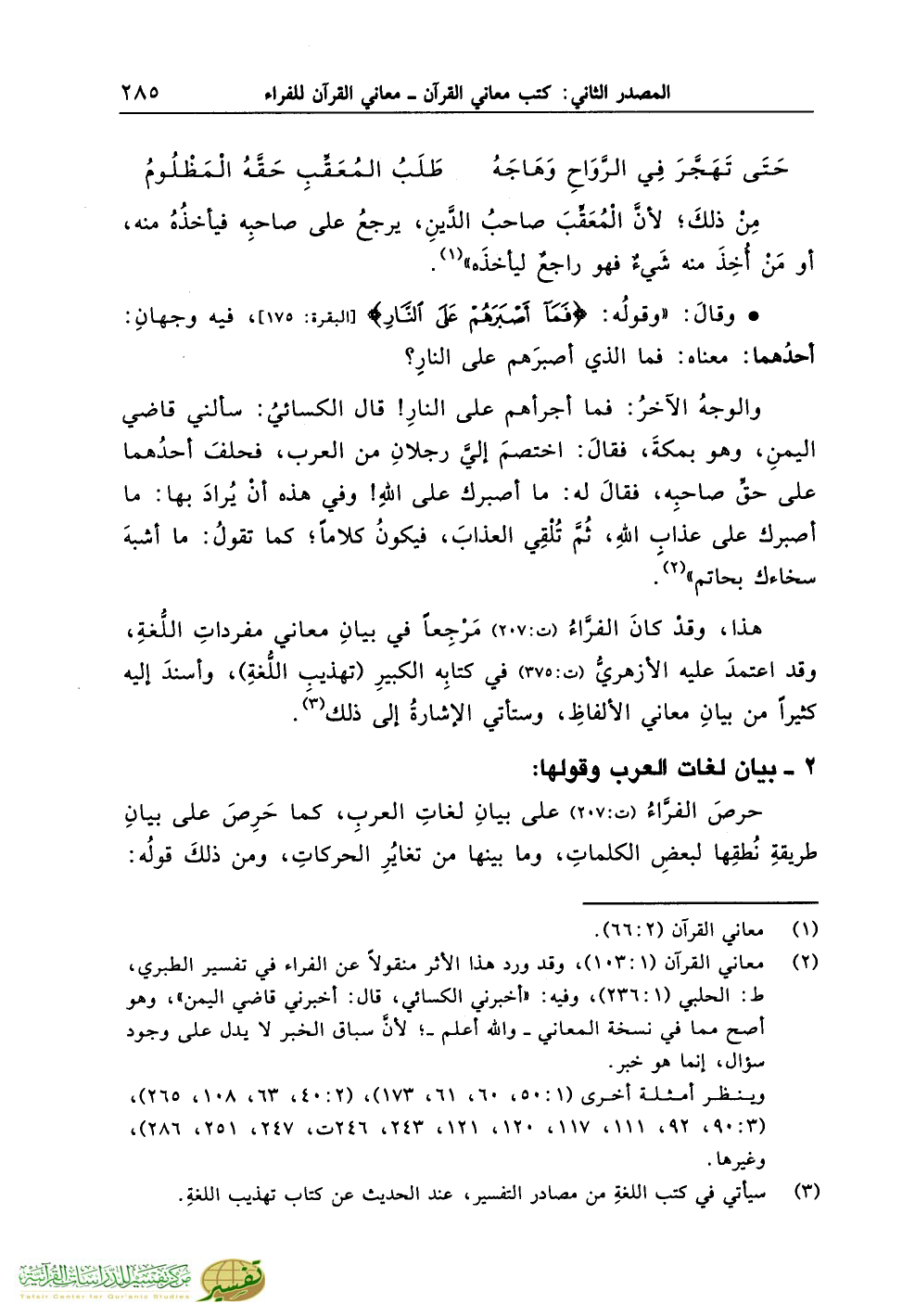 هذا، وقدْ كانَ الفرَّاءُ (ت:207) مَرْجِعاً في بيانِ معاني مفرداتِ اللُّغةِ، وقد اعتمدَ عليه الأزهريُّ (ت:375) في كتابِه الكبيرِ (تهذيبِ اللُّغةِ)، وأسندَ إليه كثيراً من بيانِ معاني الألفاظِ، وستأتي الإشارةُ إلى ذلك (¬3).