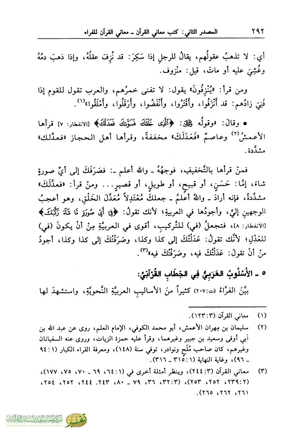 (¬3) معاني القرآن (3:244)، وينظر أمثلة أخرى في (1:64، 69 - 70، 75، 177)، (2:239، 252، 253)، (3:32، 36، 79 - 80، 243. 244، 252، 254، 261، 262، 265).