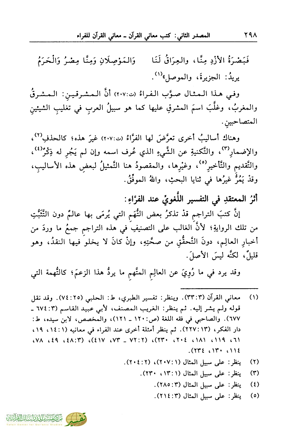 وهناك أساليبُ أخرى تعرَّضَ لها الفرَّاءُ (ت:207) غيرَ هذه؛ كالحذفِ (¬2)، والإضمارِ (¬3)، والتَّكنيةِ عن الشَّيءِ الذي عُرف اسمه وإن لم يَجُرِ له ذِكْرٌ (¬4)، والتَّقديمِ والتَّأخيرِ (¬5)، وغيْرِها، والمقصودُ هنا التَّمثيلُ لبعضِ هذه الأساليبِ، وقدْ يَمُرُّ غيرُها في ثنايا البحثِ، واللهُ الموفِّقُ.
