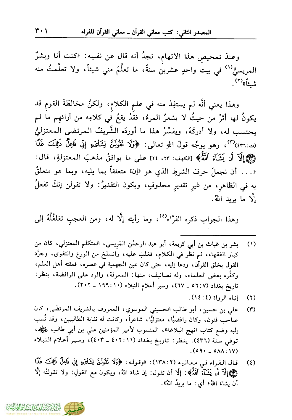 (¬4) قال الفراء في معانيه (2: 138): «وقوله: {وَلاَ تَقُولَنَّ لِشَيءٍ إِنِّي فَاعِلٌ ذَلِكَ غَدًا * إِلاَّ أَنْ يَشَاءَ اللَّهُ}: إلاَّ أن تقول: إن شاءَ اللهُ، ويكون مع القولِ: ولا تقولنَّه إلاَّ أن يشاءَ اللهُ؛ أي: ما يريدُ اللهُ».