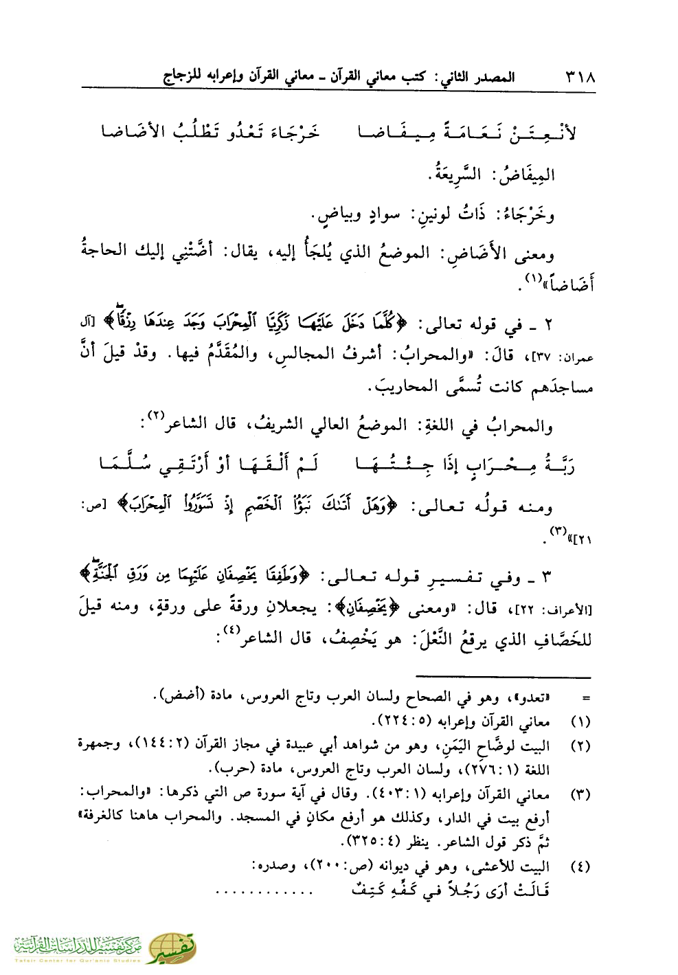 (¬3) معاني القرآن وإعرابه (1:403). وقال في آية سورة ص التي ذكرها: «والمحراب: أرفع بيت في الدار، وكذلك هو أرفع مكانٍ في المسجد. والمحراب هاهنا كالغرفة» ثمَّ ذكر قول الشاعر. ينظر (4:325).