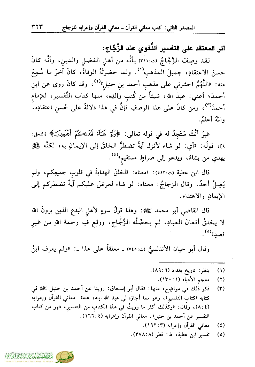 (¬3) ذكر ذلك في مواضِع، منها: «قال أبو إسحاق: روينا عن أحمد بن حنبل رحمه الله في كتابه «كتابِ التفسيرِ»، وهو مما أجازه لي عبد الله ابنه، عنه». معاني القرآن وإعرابه (4:8)، وقال: «وكذلك أكثر ما رويتُ في هذا الكتابِ من التفسيرِ، فهو من كتاب التفسير عن أحمد بن حنبل». معاني القرآن وإعرابه (4:166).
