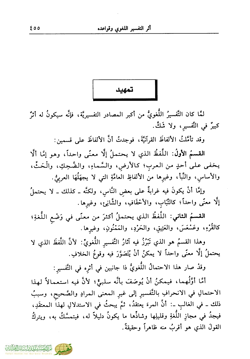 وهذا القسمُ هو الذي تَبْرُزُ فيه آثارُ التَّفسيرِ اللُّغويِّ: لأنَّ اللَّفظَ الذي لا يحتملُ إلاَّ معنًى واحداً لا يمكنُ أنْ يُتَصَوَّرَ فيه وقوعُ الخلافِ.