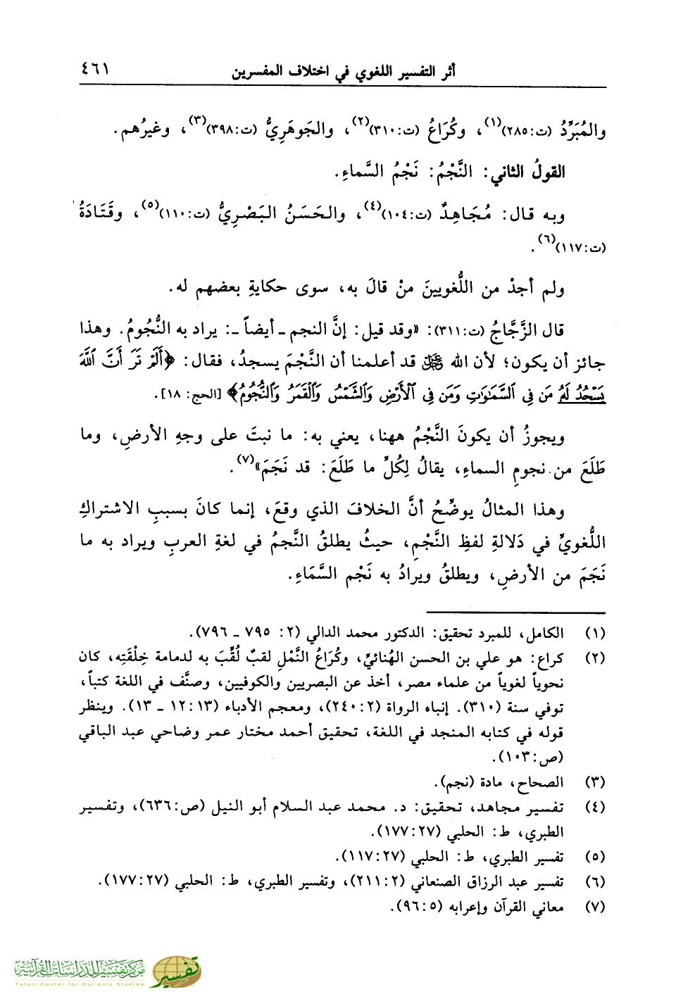 قال الزَّجَّاجُ (ت:311): «وقد قيل: إنَّ النجم ـ أيضاً ـ: يراد به النُّجُومُ. وهذا جائز أن يكون؛ لأن الله عزّ وجل قد أعلمنا أن النَّجْمَ يسجدُ، فقال: {أَلَمْ تَرَ أَنَّ اللَّهَ يَسْجُدُ لَهُ مَنْ فِي السَّمَاوَاتِ وَمَنْ فِي الأَرْضِ وَالشَّمْسُ وَالْقَمَرُ وَالنُّجُومُ} [الحج: 18].