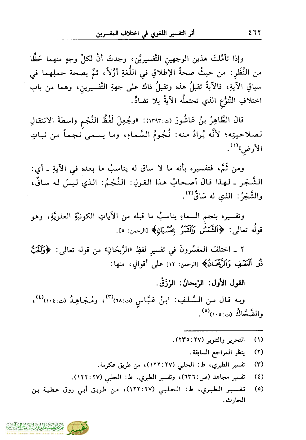 2 - اختلفَ المفسِّرونَ في تفسيرِ لفظِ «الرَّيحَانِ» من قوله تعالى: {وَالْحَبُّ ذُو الْعَصْفِ وَالرَّيْحَانُ} [الرحمن: 12] على أقوالٍ، منها:
