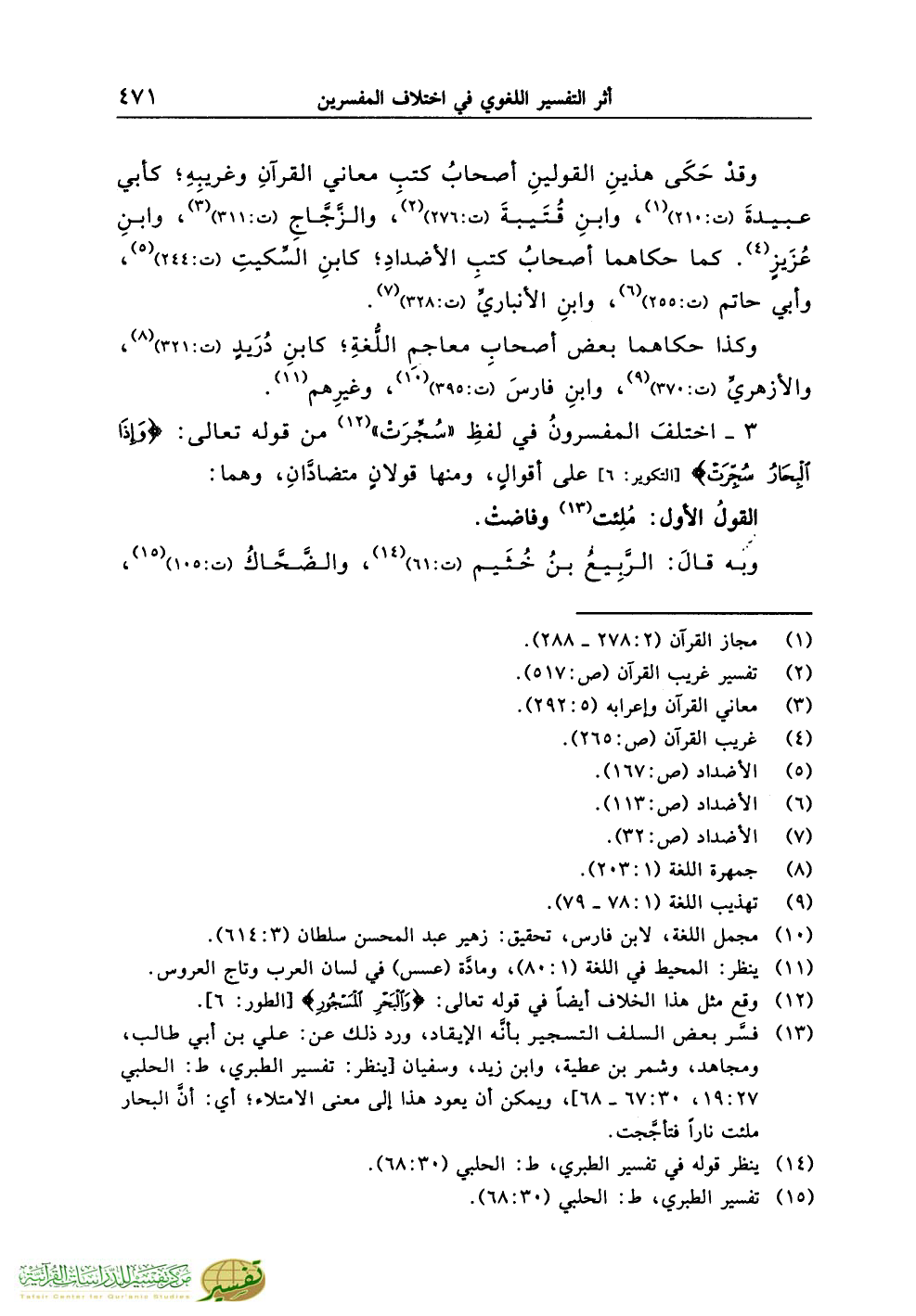 (¬13) فسَّر بعض السلف التسجير بأنَّه الإيقاد، ورد ذلك عن: علي بن أبي طالب، ومجاهد، وشمر بن عطية، وابن زيد، وسفيان [ينظر: تفسير الطبري، ط: الحلبي 27:19، 30:67 - 68]، ويمكن أن يعود هذا إلى معنى الامتلاء؛ أي: أنَّ البحار ملئت ناراً فتأجَّجت.