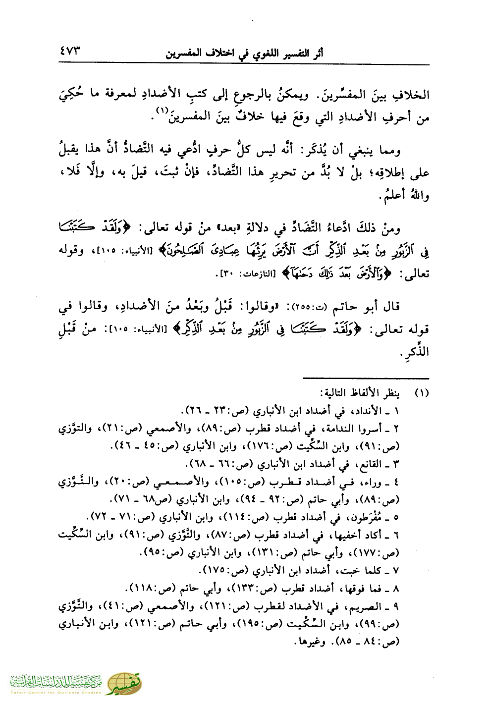 الخلافِ بينَ المفسِّرينَ. ويمكنُ بالرجوعِ إلى كتبِ الأضدادِ لمعرفةُ ما حُكِيَ من أحرفِ الأضدادِ التي وقعَ فيها خلافٌ بينَ المفسرينَ (¬1).