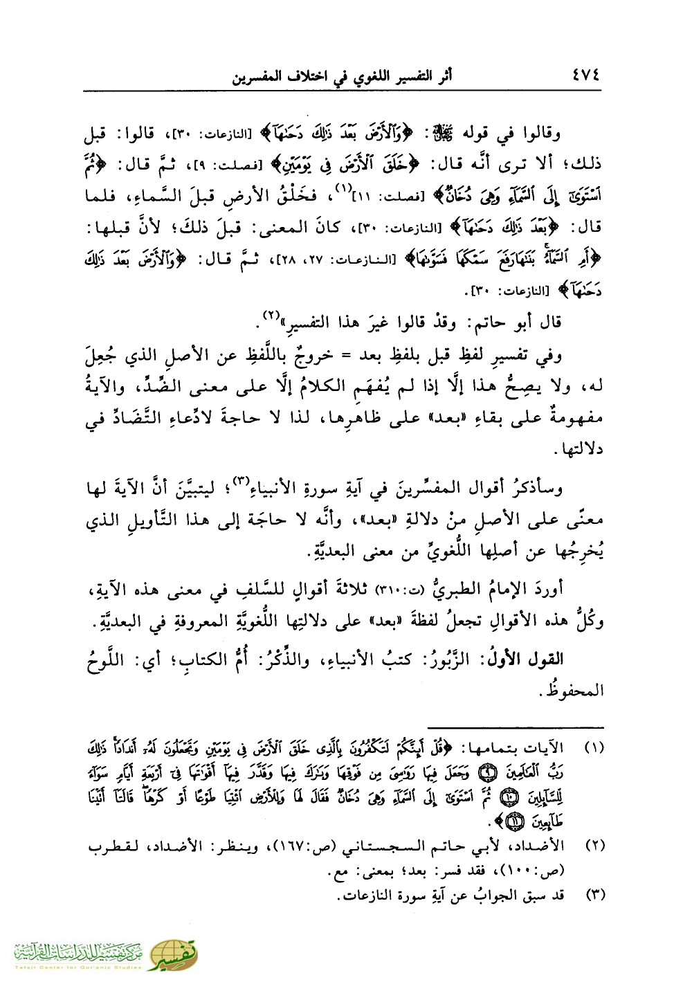 وسأذكرُ أقوال المفسِّرينَ في آيةِ سورةِ الأنبياءِ (¬3)؛ ليتبيَّنَ أنَّ الآيةَ لها معنًى على الأصلِ منْ دلالةِ «بعد»، وأنَّه لا حاجَة إلى هذا التَّأويلِ الذي يُخرِجُها عن أصلِها اللُّغويِّ من معنى البعديَّةِ.