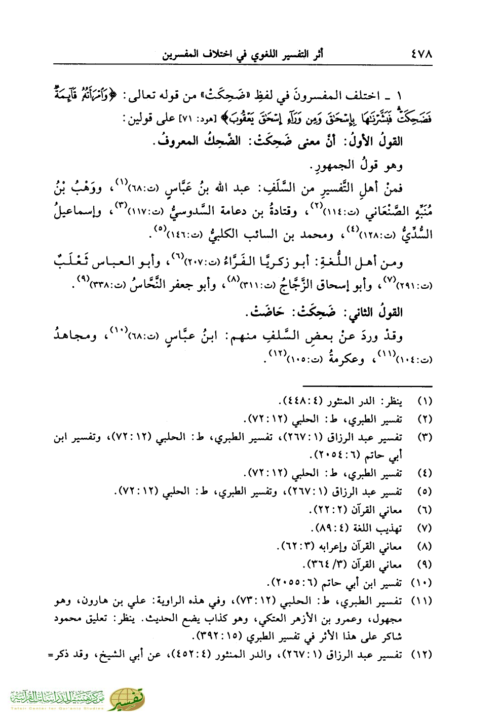 1 - اختلف المفسرونَ في لفظِ «ضَحِكَتْ» من قوله تعالى: {وَامْرَأَتُهُ قَائِمَةٌ فَضَحِكَتْ فَبَشَّرْنَاهَا بِإِسْحَاقَ وَمِنْ وَرَاءِ إِسْحَاقَ يَعْقُوبَ} [هود: 71] على قولين: