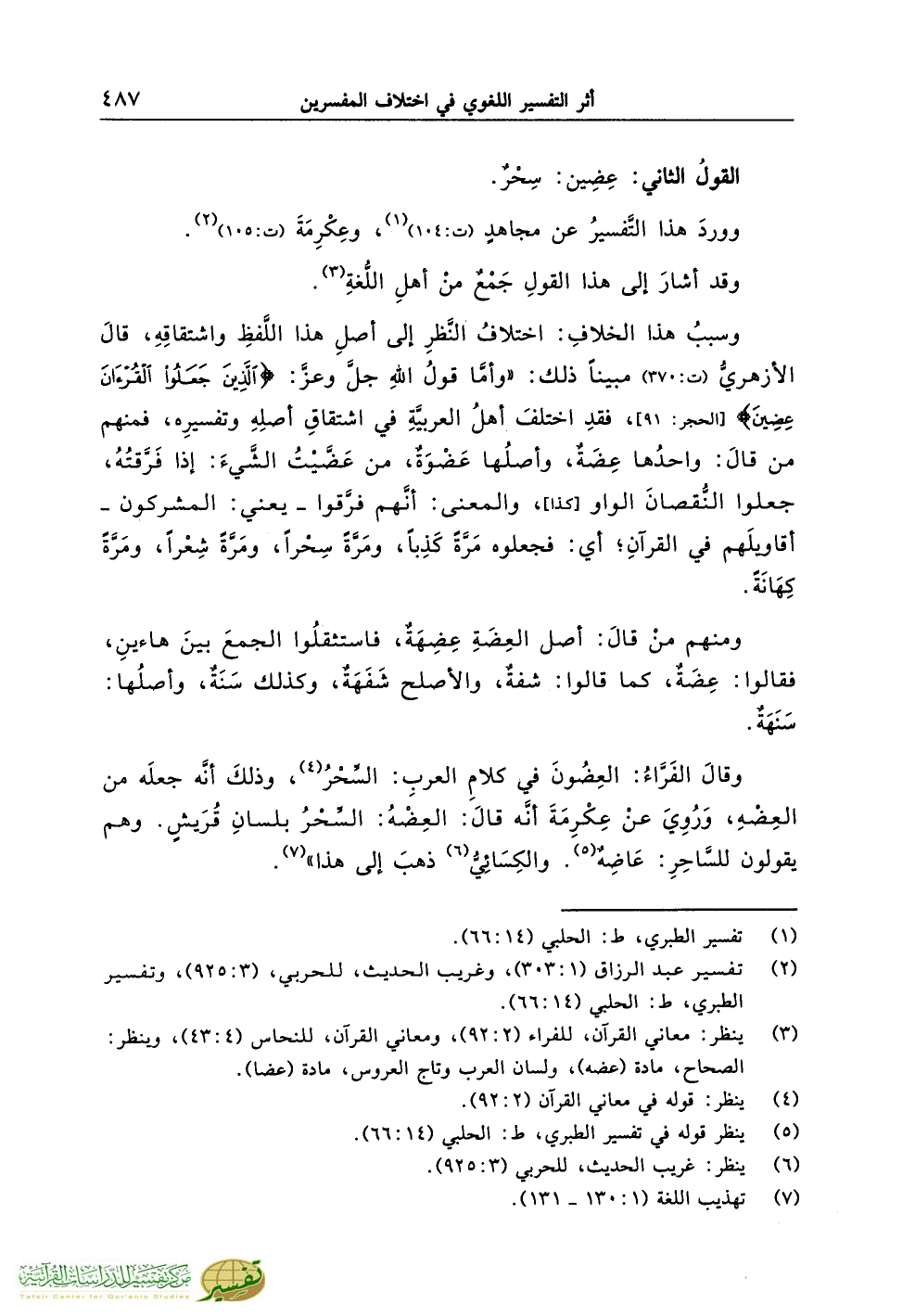 (¬3) ينظر: معاني القرآن، للفراء (2:92)، ومعاني القرآن، للنحاس (4:43)، وينظر: الصحاح، مادة (عضه)، ولسان العرب وتاج العروس، مادة (عضا).