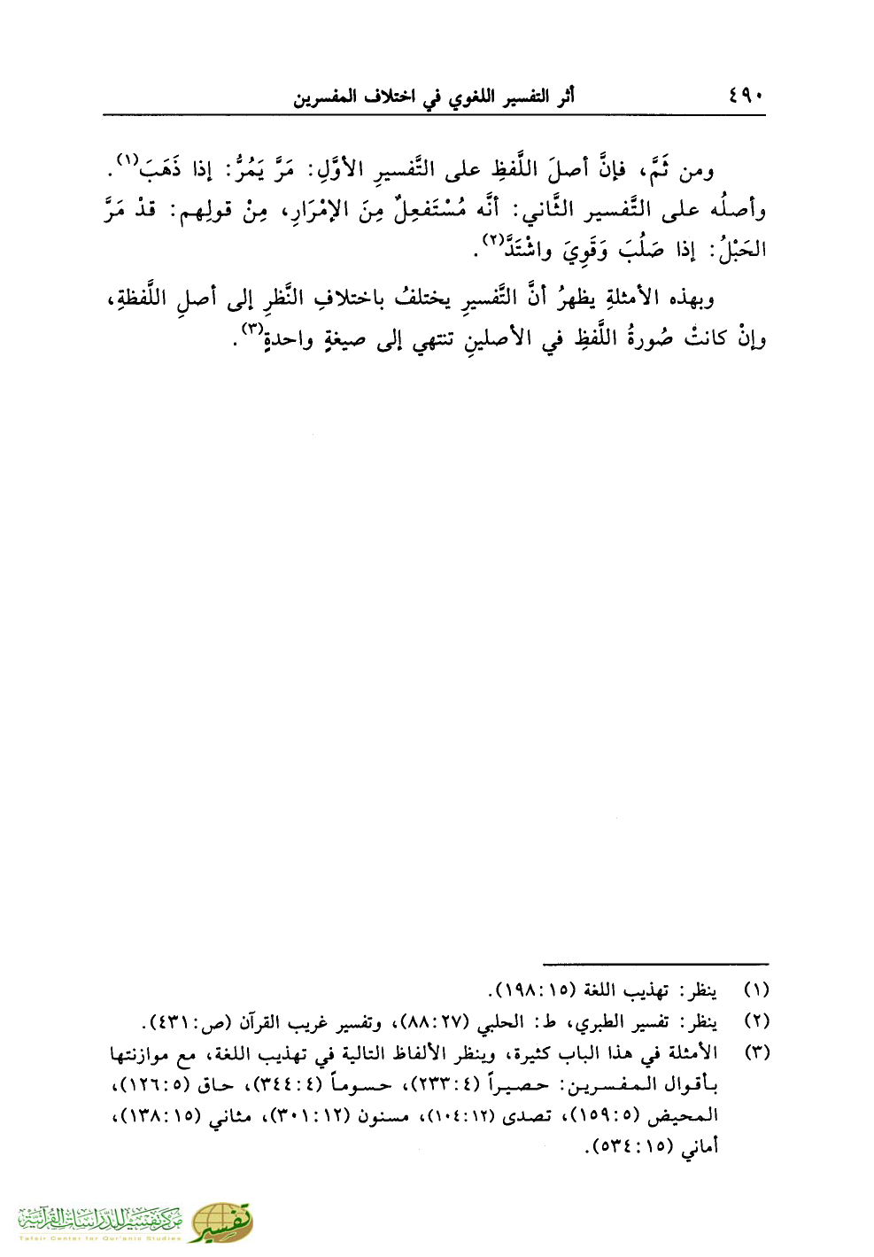 (¬3) الأمثلة في هذا الباب كثيرة، وينظر الألفاظ التالية في تهذيب اللغة، مع موازنتها بأقوال المفسرين: حصيراً (4:233)، حسوماً (4:344)، حاق (5:126)، المحيض (5:159)، تصدى (12:104)، مسنون (12:301)، مثاني (15:138)، أماني (15:534).