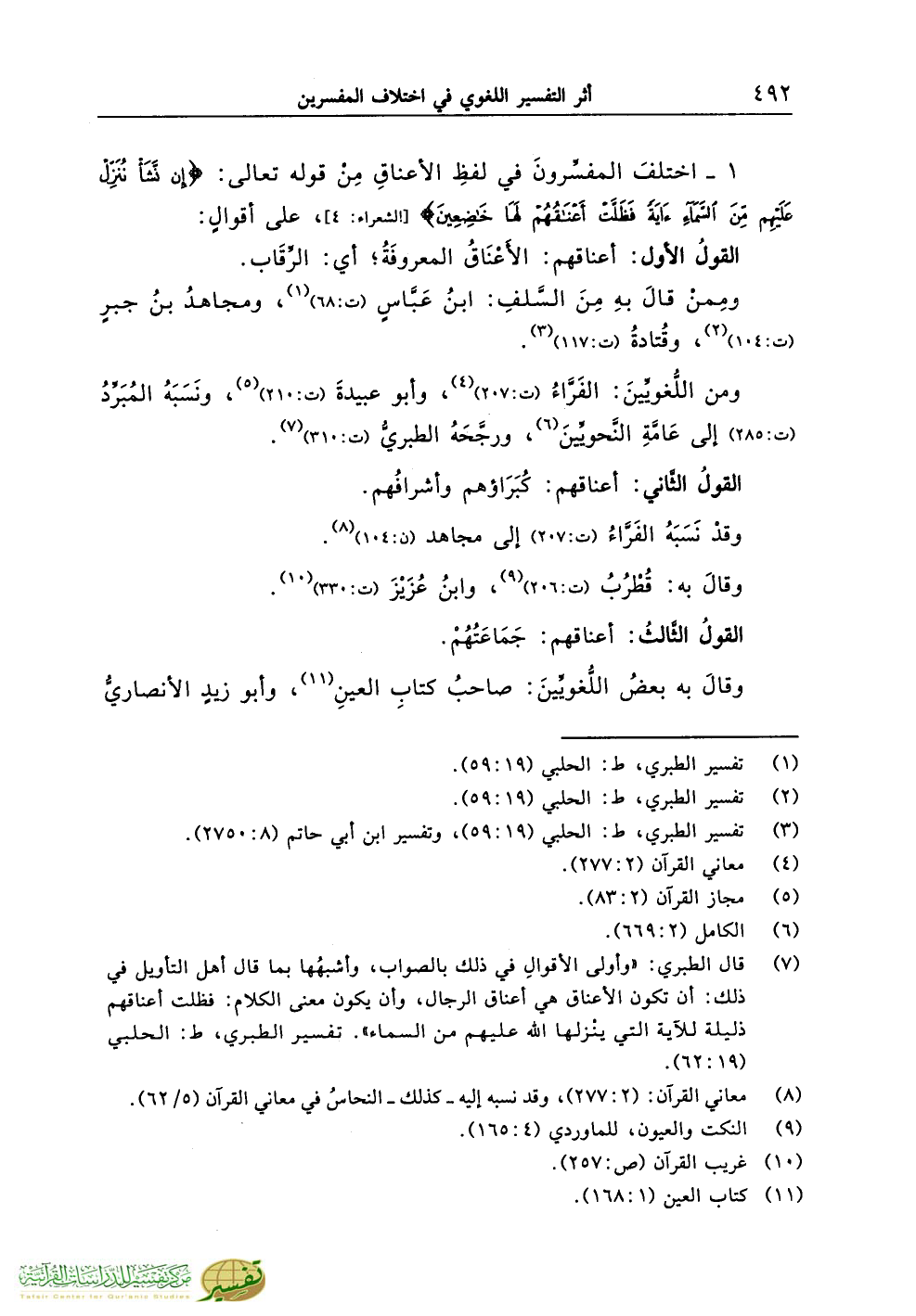 1 - اختلفَ المفسِّرونَ في لفظِ الأعناقِ مِنْ قوله تعالى: {إِنْ نَشَا نُنَزِّلْ عَلَيْهِمْ مِنَ السَّمَاءِ آيَةً فَظَلَّتْ أَعْنَاقُهُمْ لَهَا خَاضِعِينَ} [الشعراء: 4]، على أقوالٍ: