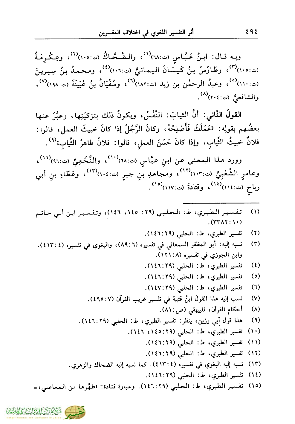 القولُ الثَّاني: أنَّ الثيابَ: النَّفْسُ، ويكونُ ذلك بتزكيَتِها، وعبَّرَ عنها بعضُهم بقولِه: «عَمَلَكَ فَأَصْلِحْهُ، وكانَ الرَّجُلُ إذا كانَ خبيثَ العمل، قالوا: فلانٌ خبيثُ الثِّيابِ، وإذا كانَ حَسَنَ العملِ، قالوا: فلانٌ طاهرُ الثِّيابِ» (¬9).