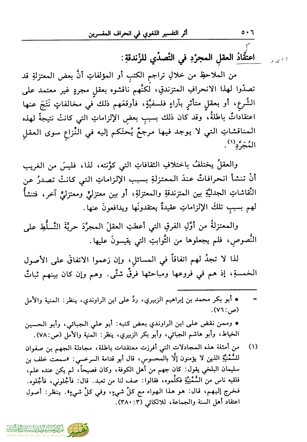 من الملاحظِ من خلالِ تراجمِ الكتبِ أو المؤلفاتِ أنَّ بعض المعتزلةِ قد تصدّوا لهذا الانحرافِ المتزندقِ، لكنَّهم ناقشوه بعقلٍ مجردٍ غير معتمد على الشَّرعِ، أو بعقلٍ متأثرٍ بآراءٍ فلسفيَّةٍ، فأوقعَهم ذلك في مخالفاتٍ نَتَجَ عنها اعتقاداتٌ باطلةُ، وقد كان ذلك بسببِ بعضِ الإلزاماتِ التي كانتْ نتيجةً لهذه المناقشاتِ التي لا يوجد فيها مرجعٌ يُحتَكم إليه في النِّزاعِ سوى العقلِ المُجَرَّدِ (¬1).