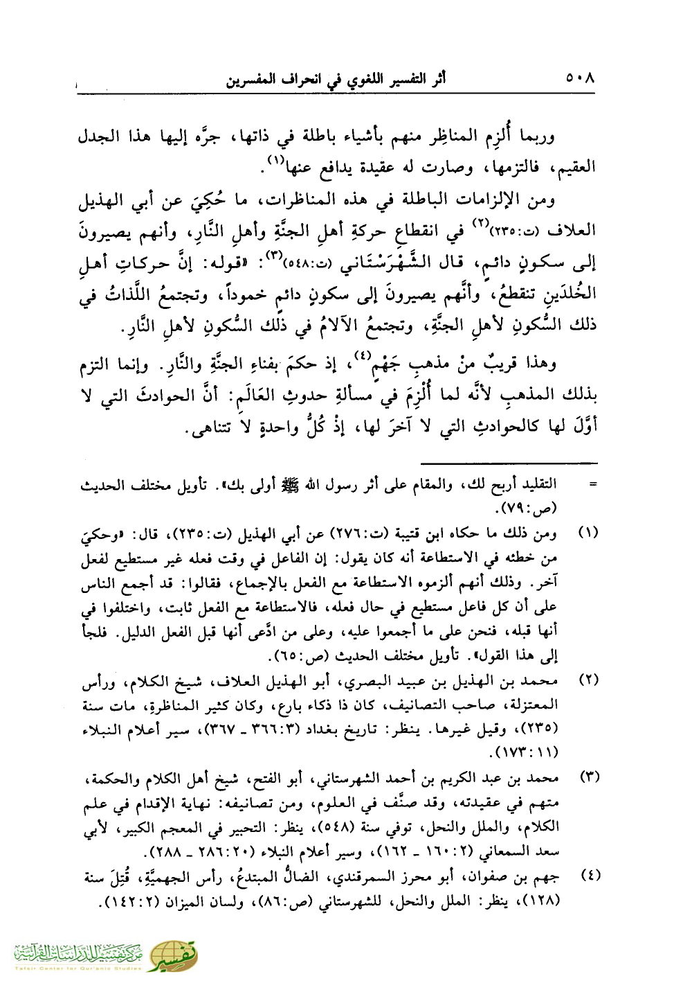 ومن الإلزامات الباطلة في هذه المناظرات، ما حُكِيَ عن أبي الهذيل العلاف (ت:235) (¬2) في انقطاعِ حركةِ أهلِ الجنَّةِ وأهلِ النَّارِ، وأنهم يصيرونَ إلى سكونٍ دائمٍ، قال الشَّهْرَسْتَاني (ت:548) (¬3): «قوله: إنَّ حركاتِ أهلِ الخُلدَينِ تنقطعُ، وأنَّهم يصيرونَ إلى سكونٍ دائمٍ خموداً، وتجتمعُ اللَّذاتُ في ذلك السُّكونِ لأهلِ الجنَّةِ، وتجتمعُ الآلامُ في ذلك السُّكونِ لأهلِ النَّارِ.
