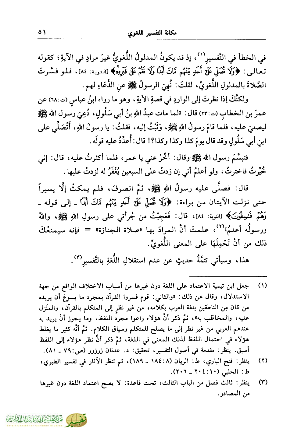 في الخطأ في التَّفسيرِ (¬1)، إذ قد يكونُ المدلولُ اللُّغويُّ غيرَ مرادٍ في الآيةِ؛ كقوله تعالى: {وَلاَ تُصَلِّ عَلَى أَحَدٍ مِنْهُمْ مَاتَ أَبَدًا وَلاَ تَقُمْ عَلَى قَبْرِهِ} [التوبة: 84]، فلو فسَّرتَ الصَّلاةَ بالمدلولِ اللُّغويِّ، لقلتَ: نُهِيَ الرسولُ صلّى الله عليه وسلّم عنِ الدُّعَاءِ لهم.