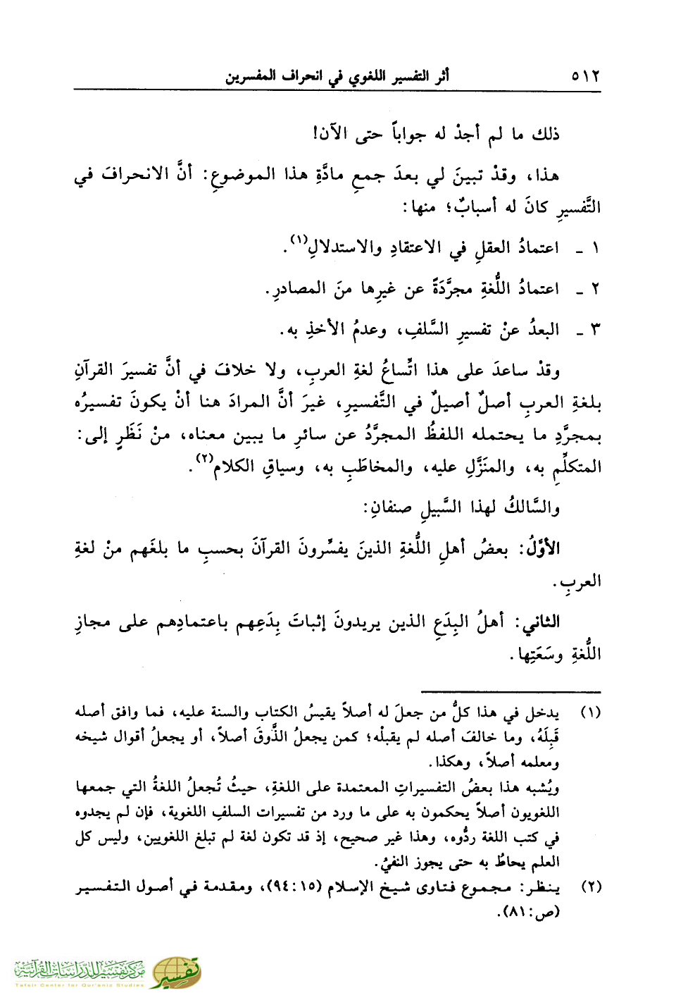 الأوَّلُ: بعضُ أهلِ اللُّغةِ الذينَ يفسِّرونَ القرآنَ بحسبِ ما بلغَهم منْ لغةِ العربِ.