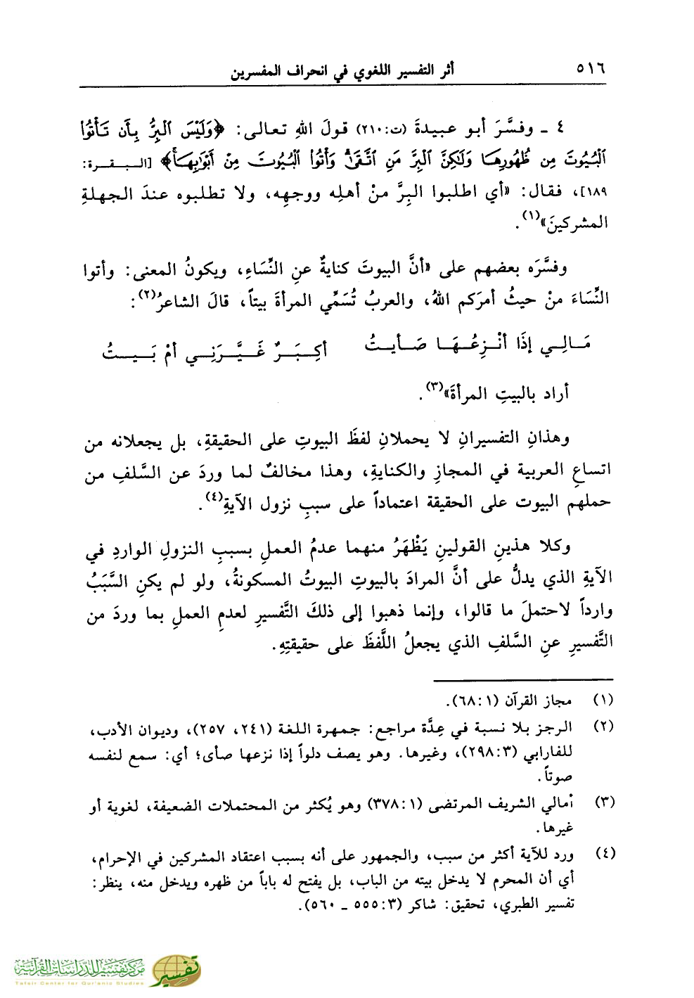 4 - وفسَّرَ أبو عبيدةَ (ت:210) قولَ اللهِ تعالى: {وَلَيْسَ الْبِرُّ بِأَنْ تَاتُوا الْبُيُوتَ مِنْ ظُهُورِهَا وَلَكِنَّ الْبِرَّ مَنِ اتَّقَى وَاتُوا الْبُيُوتَ مِنْ أَبْوَابِهَا} [البقرة: 189]، فقال: «أي اطلبوا البِرَّ منْ أهلِه ووجهِه، ولا تطلبوه عندَ الجهلةِ المشركينَ» (¬1).