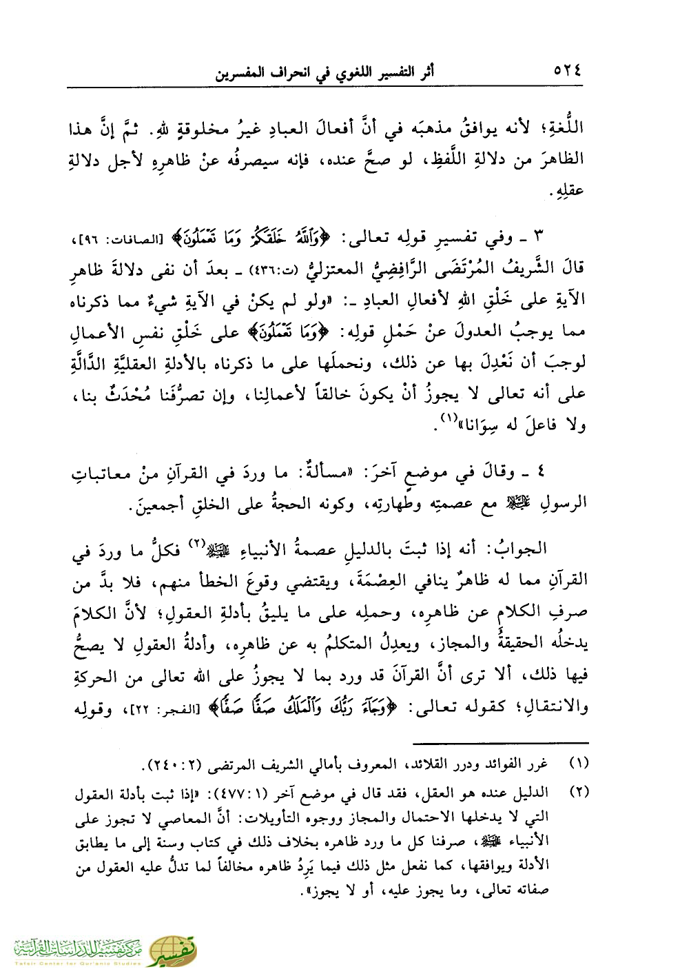 3 - وفي تفسيرِ قولِه تعالى: {وَاللَّهُ خَلَقَكُمْ وَمَا تَعْمَلُونَ} [الصافات: 96]، قالَ الشَّريفُ المُرْتَضَى الرَّافِضِيُّ المعتزليُّ (ت:436) ـ بعدَ أن نفى دلالةَ ظاهرِ الآيةِ على خَلْقِ اللهِ لأفعالِ العبادِ ـ: «ولو لم يكنْ في الآيةِ شيءٌ مما ذكرناه مما يوجبُ العدولَ عنْ حَمْلِ قولِه: {وَمَا تَعْمَلُونَ} على خَلْقِ نفسِ الأعمالِ لوجبَ أن نَعْدِلَ بها عن ذلك، ونحملَها على ما ذكرناه بالأدلةِ العقليَّةِ الدَّالَّةِ على أنه تعالى لا يجوزُ أنْ يكونَ خالقاً لأعمالِنا، وإن تصرُّفَنا مُحْدَثٌ بنا، ولا فاعلَ له سِوَانا» (¬1).