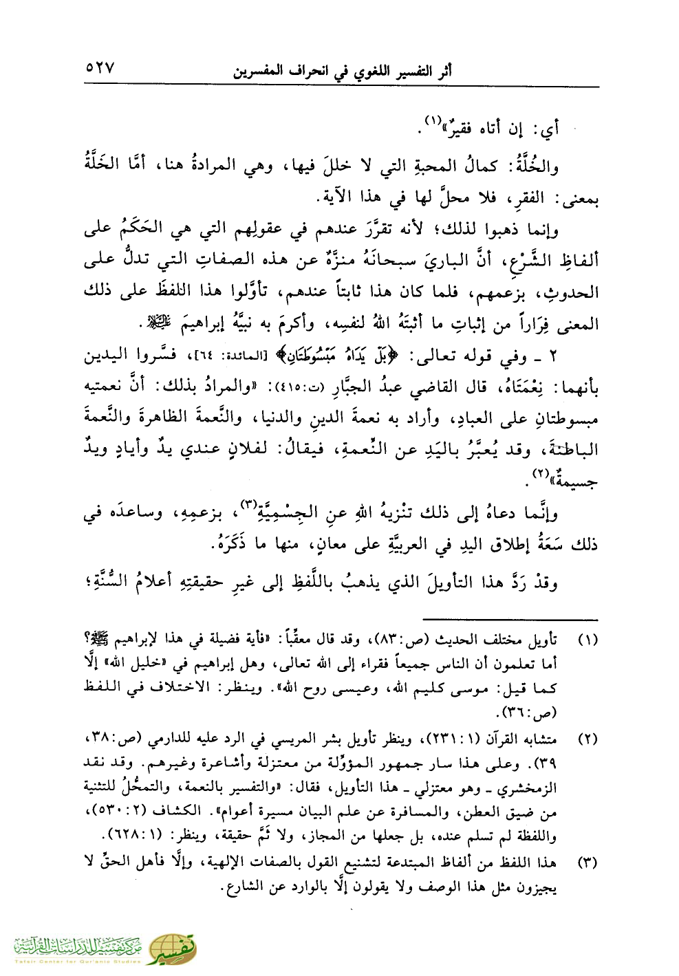 (¬2) متشابه القرآن (1:231)، وينظر تأويل بشر المريسي في الرد عليه للدارمي (ص:38، 39). وعلى هذا سار جمهور المؤوِّلة من معتزلة وأشاعرة وغيرهم. وقد نقد الزمخشري ـ وهو معتزلي ـ هذا التأويل، فقال: «والتفسير بالنعمة، والتمحُّلُ للتثنية من ضيق العطن، والمسافرة عن علم البيان مسيرة أعوام». الكشاف (2:530)، واللفظة لم تسلم عنده، بل جعلها من المجاز، ولا ثَمَّ حقيقة، وينظر: (1:628).