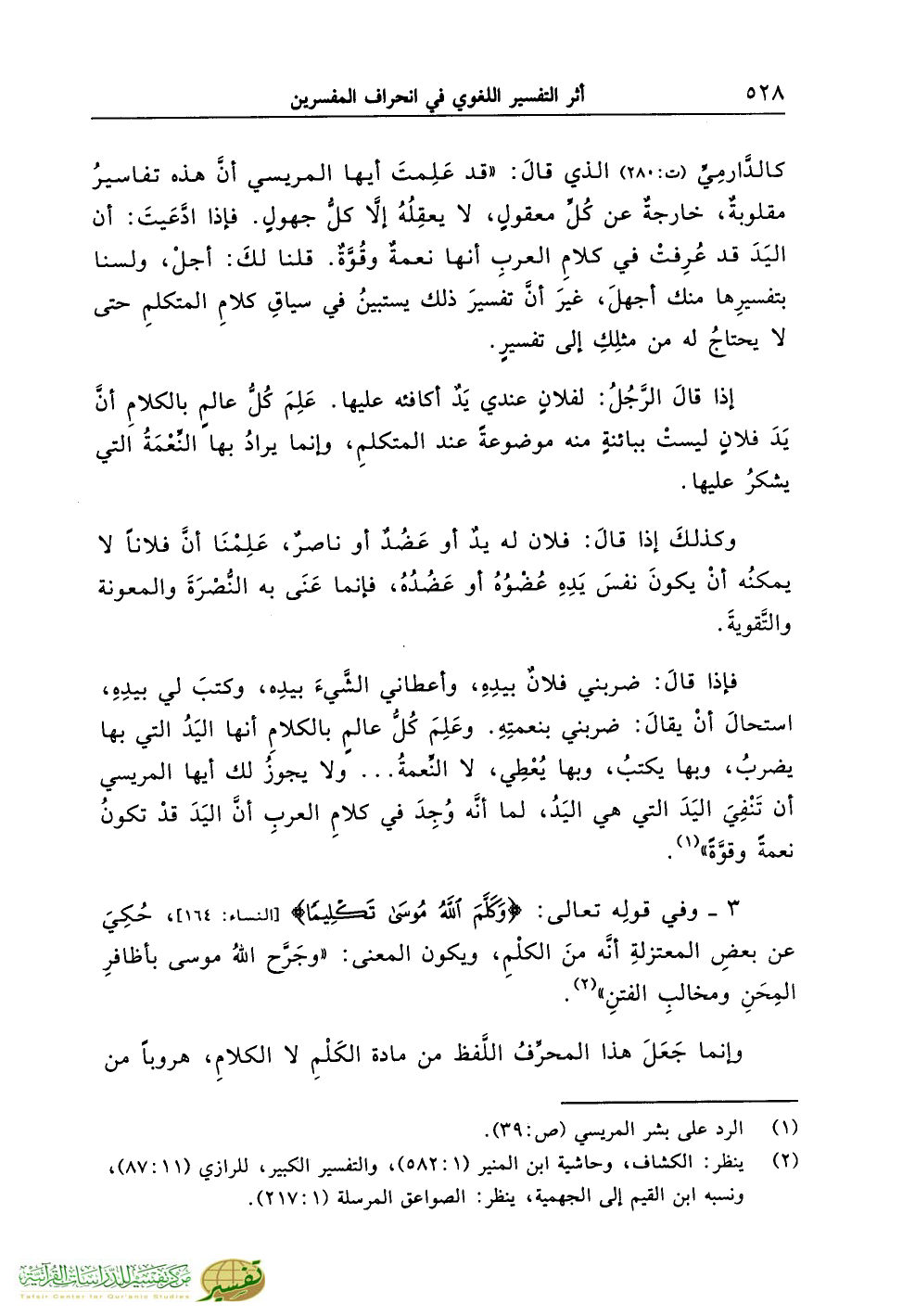 كالدَّارمِيِّ (ت:280) الذي قالَ: «قد عَلِمتَ أيها المريسي أنَّ هذه تفاسيرُ مقلوبةٌ، خارجةٌ عن كُلِّ معقولٍ، لا يعقِلُهُ إلاَّ كلُّ جهولٍ. فإذا ادَّعَيتَ: أن اليَدَ قد عُرِفتْ في كلامِ العربِ أنها نعمةٌ وقُوَّةٌ. قلنا لكَ: أجلْ، ولسنا بتفسيرِها منك أجهلَ، غيرَ أنَّ تفسيرَ ذلك يستبينُ في سياقِ كلامِ المتكلمِ حتى لا يحتاجُ له من مثلِكِ إلى تفسيرٍ.