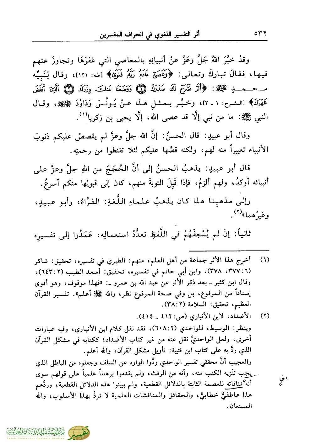 والعجيب أنَّ محققي تفسير الواحدي ردُّوا الوارد عن السلف وجعلوه من الباطل الذي يجب تنْزيه الكتب منه، وأنه من الرفث، ولم يقدموا برهاناً علمياً على قولهم سوى أنه منافٍ للعصمة الثابتة بالدلائل القطعية، ولم يبينوا هذه الدلائل القطعية، وردُّهم هذا عاطفيُّ خطابيُّ، والحقائق والمناقشات العلمية لا تردُّ بهذا الأسلوب، والله المستعان.