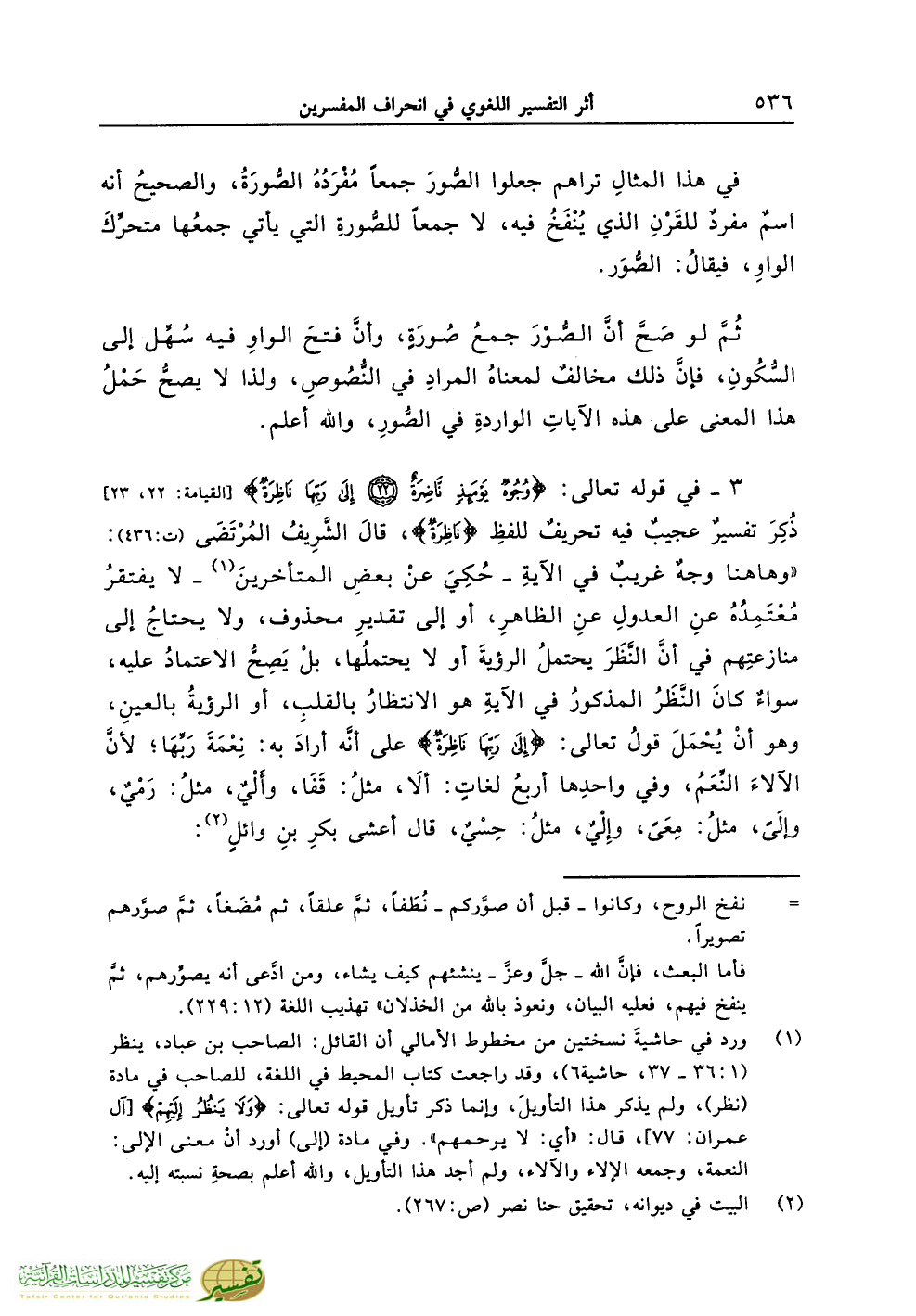 3 - في قوله تعالى: {وَجُوهٌ يَوْمَئِذٍ نَاضِرَةٌ *إِلَى رَبِّهَا نَاظِرَةٌ} [القيامة: 22، 23] ذُكِرَ تفسيرٌ عجيبٌ فيه تحريفٌ للفظِ {نَاظِرَةٌ}، قالَ الشَّرِيفُ المُرْتَضَى (ت:436): «وهاهنا وجهٌ غريبٌ في الآيةِ ـ حُكِيَ عنْ بعضِ المتأخرينَ (¬1) ـ لا يفتقرُ مُعْتَمِدُهُ عنِ العدولِ عنِ الظاهرِ، أو إلى تقديرِ محذوف، ولا يحتاجُ إلى منازعتِهم في أنَّ النَّظَرَ يحتملُ الرؤيةَ أو لا يحتملُها، بلْ يَصِحُّ الاعتمادُ عليه، سواءٌ كانَ النَّظَرُ المذكورُ في الآيةِ هو الانتظارُ بالقلبِ، أو الرؤيةُ بالعينِ، وهو أنْ يُحْمَلَ قولُه تعالى: {إِلَى رَبِّهَا نَاظِرَةٌ} على أنَّه أرادَ به: نِعْمَةَ رَبِّهَا؛ لأنَّ الآلاءَ النِّعَمُ، وفي واحدِها أربعُ لغاتٍ: ألاَ، مثلُ: قَفَا، وأَلْيٌ، مثلُ: رَمْيٌ، وإلَىً، مثلُ: مِعَىً، وإِلْيٌ، مثلُ: حِسْيٌ، قال أعشى بكرِ بنِ وائلٍ (¬2):