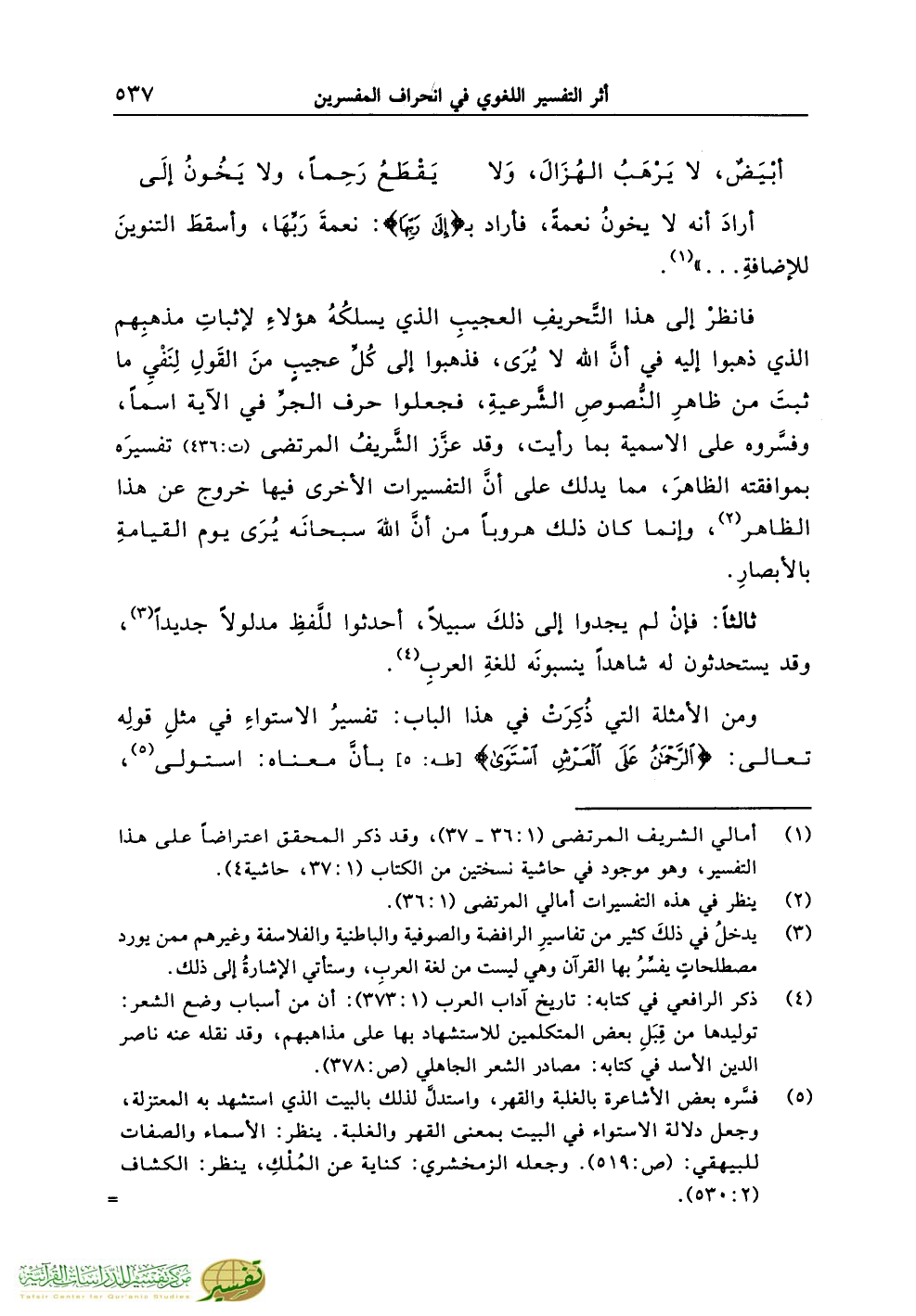 فانظرْ إلى هذا التَّحريفِ العجيبِ الذي يسلكُهُ هؤلاءِ لإثباتِ مذهبِهم الذي ذهبوا إليه في أنَّ الله لا يُرَى، فذهبوا إلى كُلِّ عجيبٍ منَ القَولِ لِنَفْيِ ما ثبتَ من ظاهرِ النُّصوصِ الشَّرعيةِ، فجعلوا حرف الجرِّ في الآية اسماً، وفسَّروه على الاسمية بما رأيت، وقد عزَّز الشَّريفُ المرتضى (ت:436) تفسيرَه بموافقته الظاهرَ، مما يدلك على أنَّ التفسيرات الأخرى فيها خروج عن هذا الظاهر (¬2)، وإنما كان ذلك هروباً من أنَّ اللهَ سبحانَه يُرَى يوم القيامةِ بالأبصارِ.