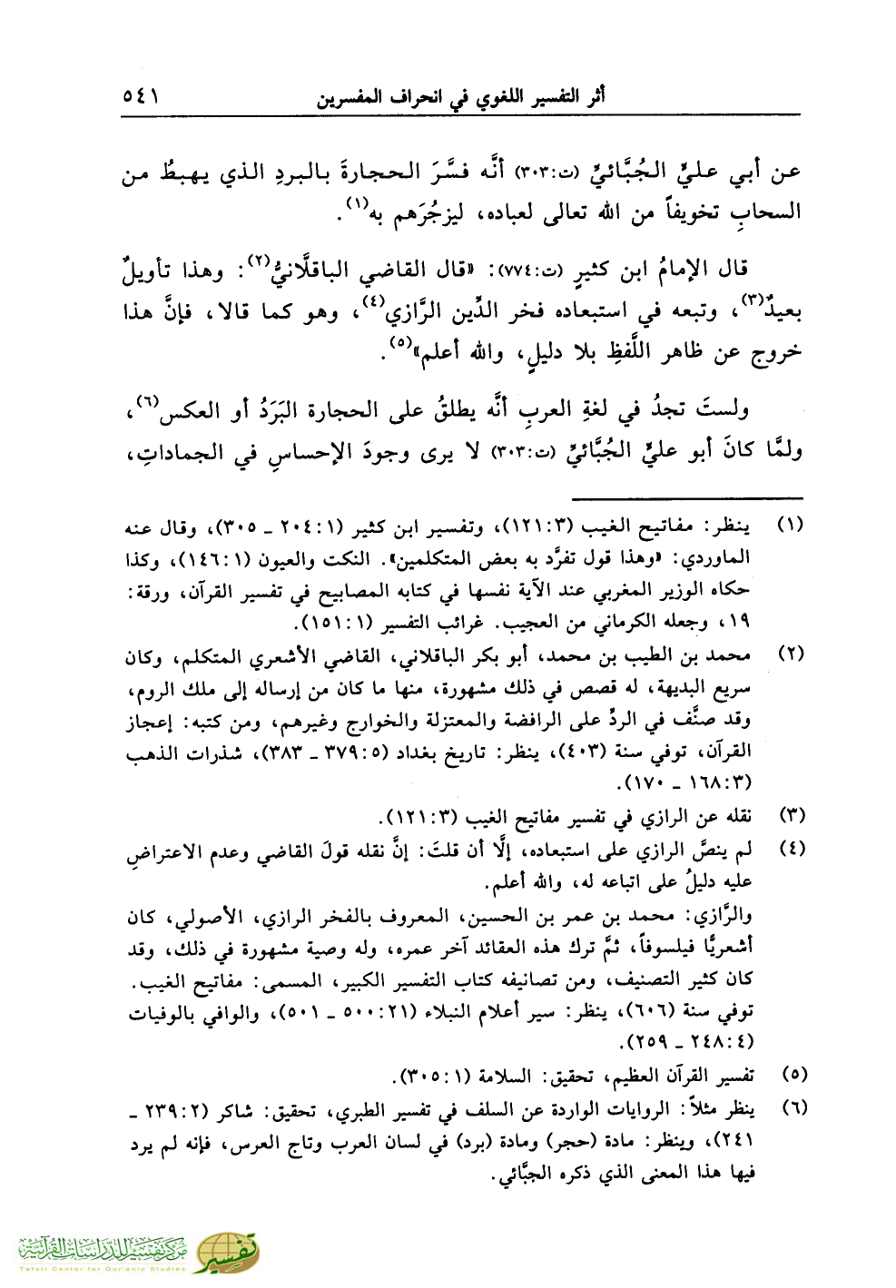 (¬6) ينظر مثلاً: الروايات الواردة عن السلف في تفسير الطبري، تحقيق: شاكر (2:239 - 241)، وينظر: مادة (حجر) ومادة (برد) في لسان العرب وتاج العرس، فإنه لم يرد فيها هذا المعنى الذي ذكره الجبَّائي.