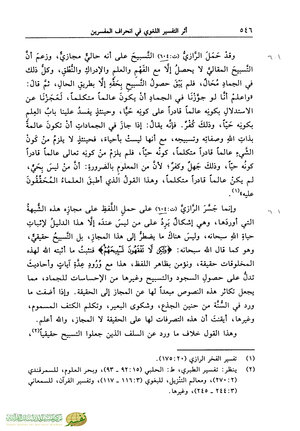 وقدْ حَمَلَ الرَّازيُّ (ت:604) التَّسبيحَ على أنه حاليٌّ مجازيٌّ، وزعمَ أنَّ التَّسبيحَ المقاليَّ لا يحصلُ إلاَّ مع الفَهْمِ والعلمِ والإدراكِ والنُّطْقِ، وكلُّ ذلك في الجمادِ مُحَالٌ، فلم يَبْقَ حصولُ التَّسبيحِ بِحَقِّهِ إلاَّ بطريقِ الحالِ، ثمَّ قالَ: «واعلمْ أنَّا لو جوَّزْنَا في الجمادِ أنْ يكونَ عالماً متكلماً، لَعَجَزْنَا عن الاستدلالِ بكونِه عالماً قادراً على كونِه حَيًّا، وحينئذٍ يفسدُ علينا بابُ العِلمِ بكونِه حَيّاً، وذلكَ كُفْرٌ. فإنَّه يقالُ: إذا جازَ في الجماداتِ أنْ تكونَ عالمةً بذاتِ اللهِ وصفاتِه وتسبيحِه، مع أنها ليستْ بأحياءَ، فحينئذٍ لا يلزمُ منْ كَونْ الشَّيءِ عالماً قادراً متكلماً، كونُه حيّاً، فلم يلزمْ منْ كونِه تعالى عالماً قادراً كونُه حيّاً، وذلكَ جَهلٌ وكفرٌ؛ لأنَّ من المعلومِ بالضرورةِ: أنَّ منْ ليسَ بِحَيٍّ، لم يكنْ عالماً قادراً متكلماً، وهذا القولُ الذي أطبقَ العلماءُ المُحَقِّقُونَ عليه» (¬1).