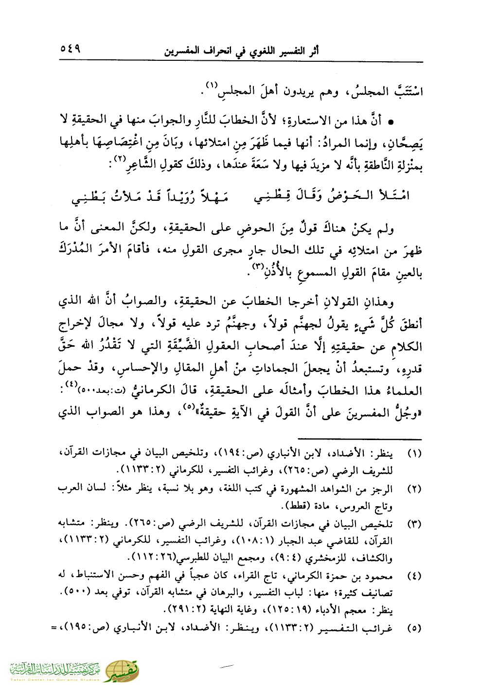 (¬3) تلخيص البيان في مجازات القرآن، للشريف الرضي (ص:265). وينظر: متشابه القرآن، للقاضي عبد الجبار (1:108)، وغرائب التفسير، للكرماني (2:1133)، والكشاف، للزمخشري (4:9)، ومجمع البيان للطبرسي (26:112).