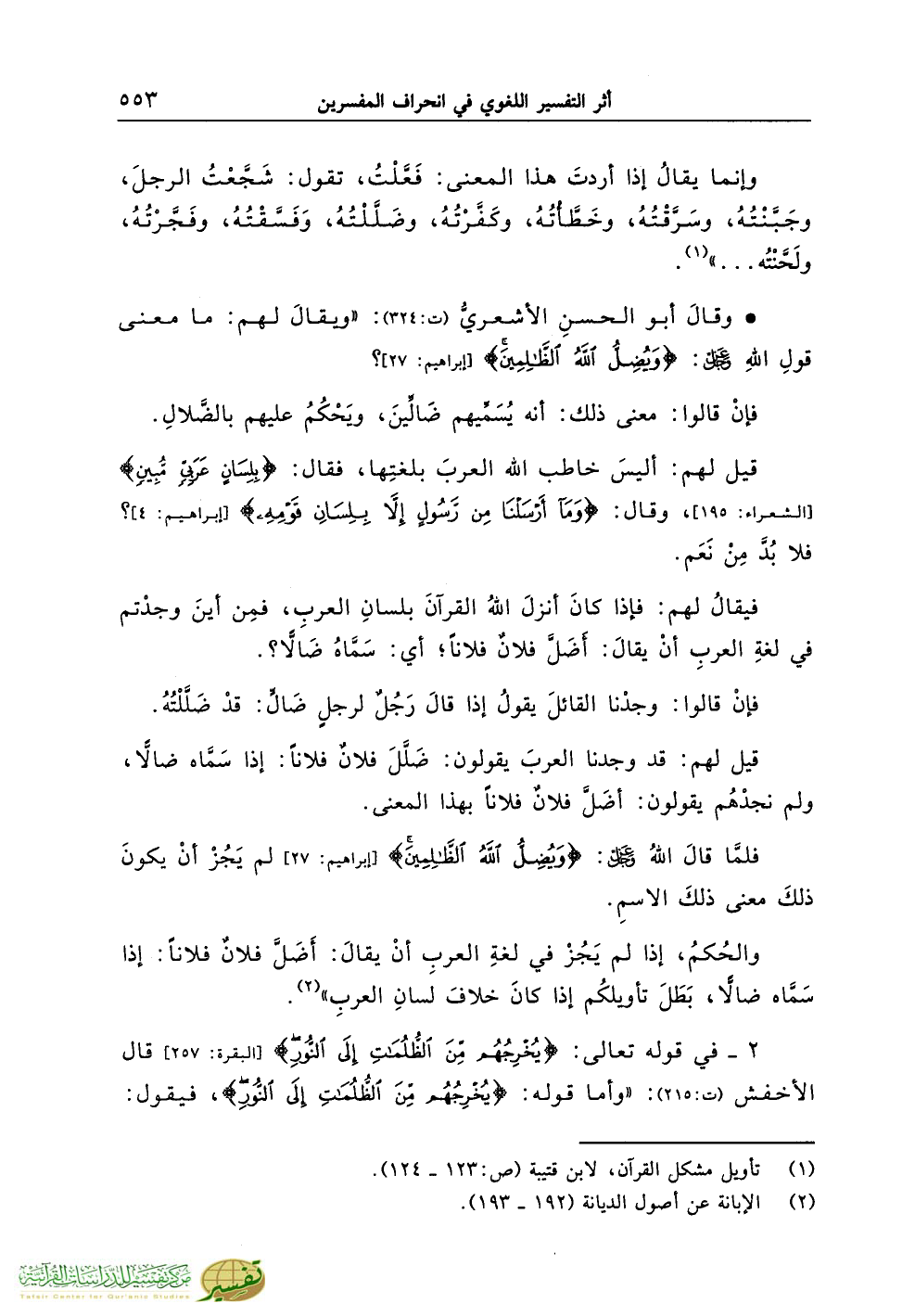 * وقالَ أبو الحسنِ الأشعريُّ (ت:324): «ويقالَ لهم: ما معنى قولِ اللهِ عزّ وجل: {وَيُضِلُّ اللَّهُ الظَّالِمِينَ} [إبراهيم: 27]؟