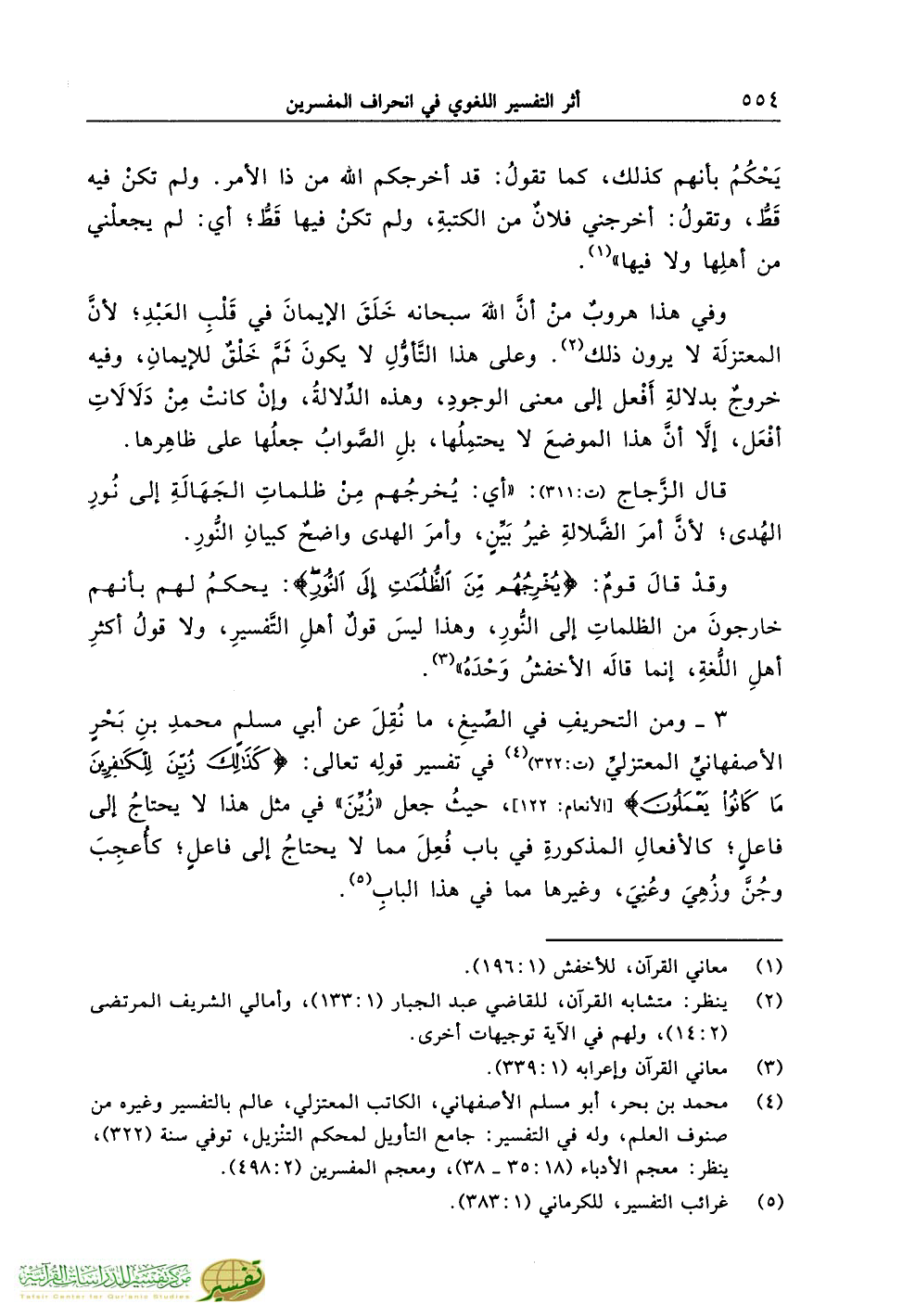 وقدْ قالَ قومٌ: {يُخْرِجُهُمْ مِنَ الظُّلُمَاتِ إِلَى النُّورِ}: يحكمُ لهم بأنهم خارجونَ من الظلماتِ إلى النُّورِ، وهذا ليسَ قولٌ أهلِ التَّفسيرِ، ولا قولُ أكثرِ أهلِ اللُّغةِ، إنما قالَه الأخفشُ وَحْدَهُ» (¬3).