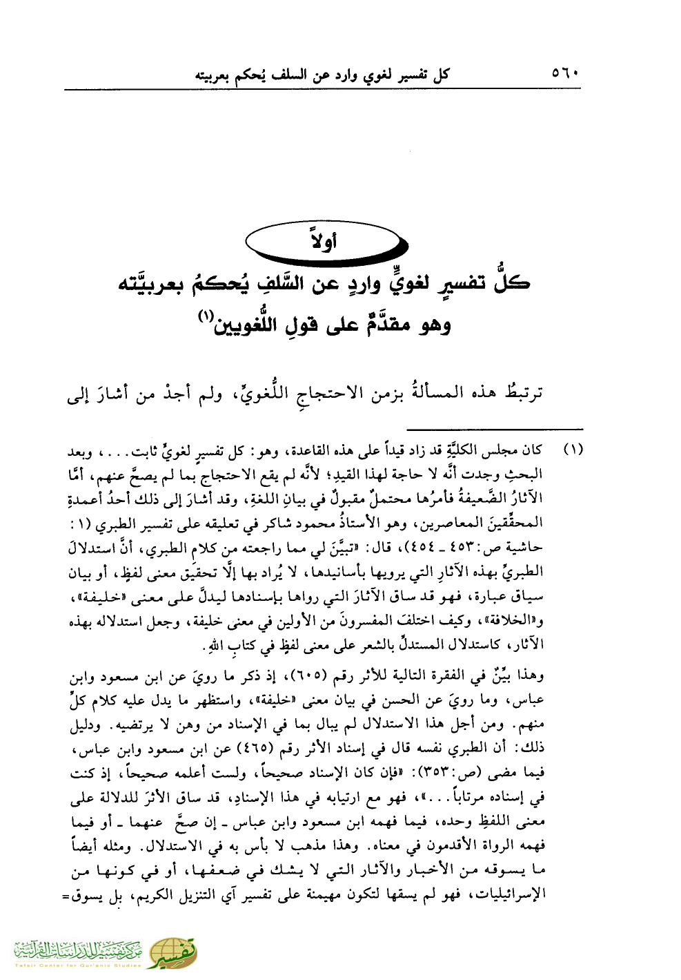 أولاً كلُّ تفسيرٍ لغويٍّ واردٍ عن السَّلفِ يُحكمُ بعربيَّته وهو مقدَّمٌ على قولِ اللُّغويين (¬1)