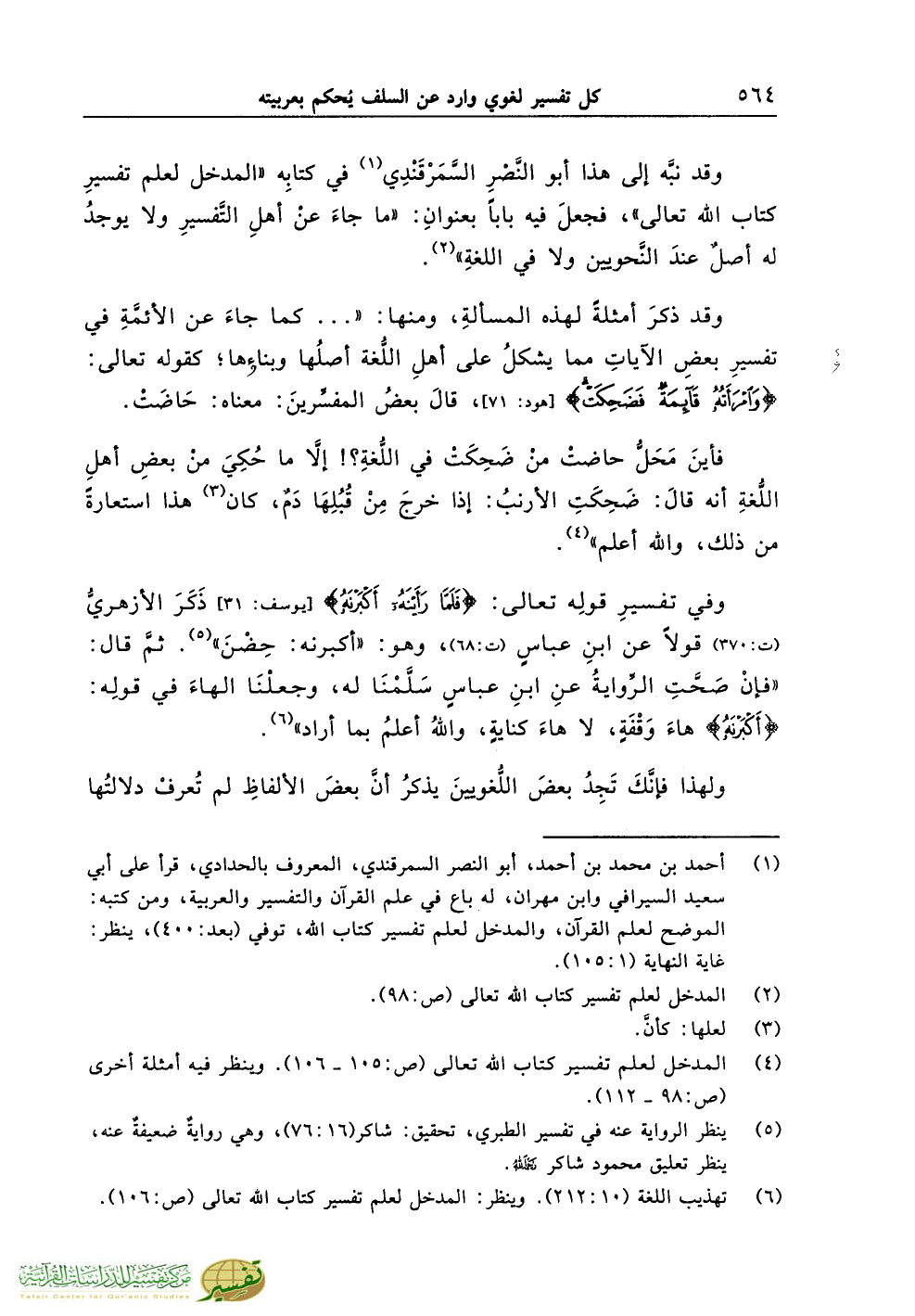 وقد نبَّه إلى هذا أبو النَّصْرِ السَّمَرْقَنْدِي (¬1) في كتابِه «المدخل لعلم تفسيرِ كتاب الله تعالى»، فجعلَ فيه باباً بعنوانِ: «ما جاءَ عنْ أهلِ التَّفسيرِ ولا يوجدُ له أصلٌ عندَ النَّحويين ولا في اللغةِ» (¬2).