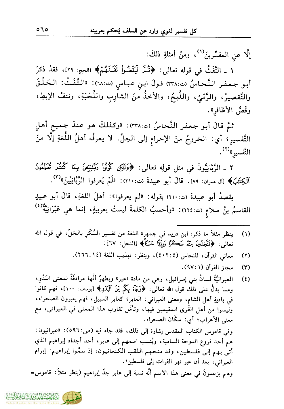 ثمَّ قالَ أبو جعفر النَّحاسُ (ت:338): «وكذلكَ هو عندَ جميعِ أهلِ التَّفسيرِ؛ أي: الخروجُ منَ الإحرامِ إلى الحِلِّ. لا يعرفُه أهلُ اللُّغةِ إلاَّ منَ التَّفسيرِ» (¬2).